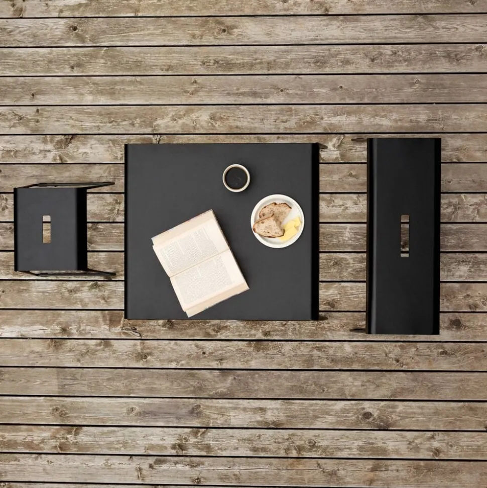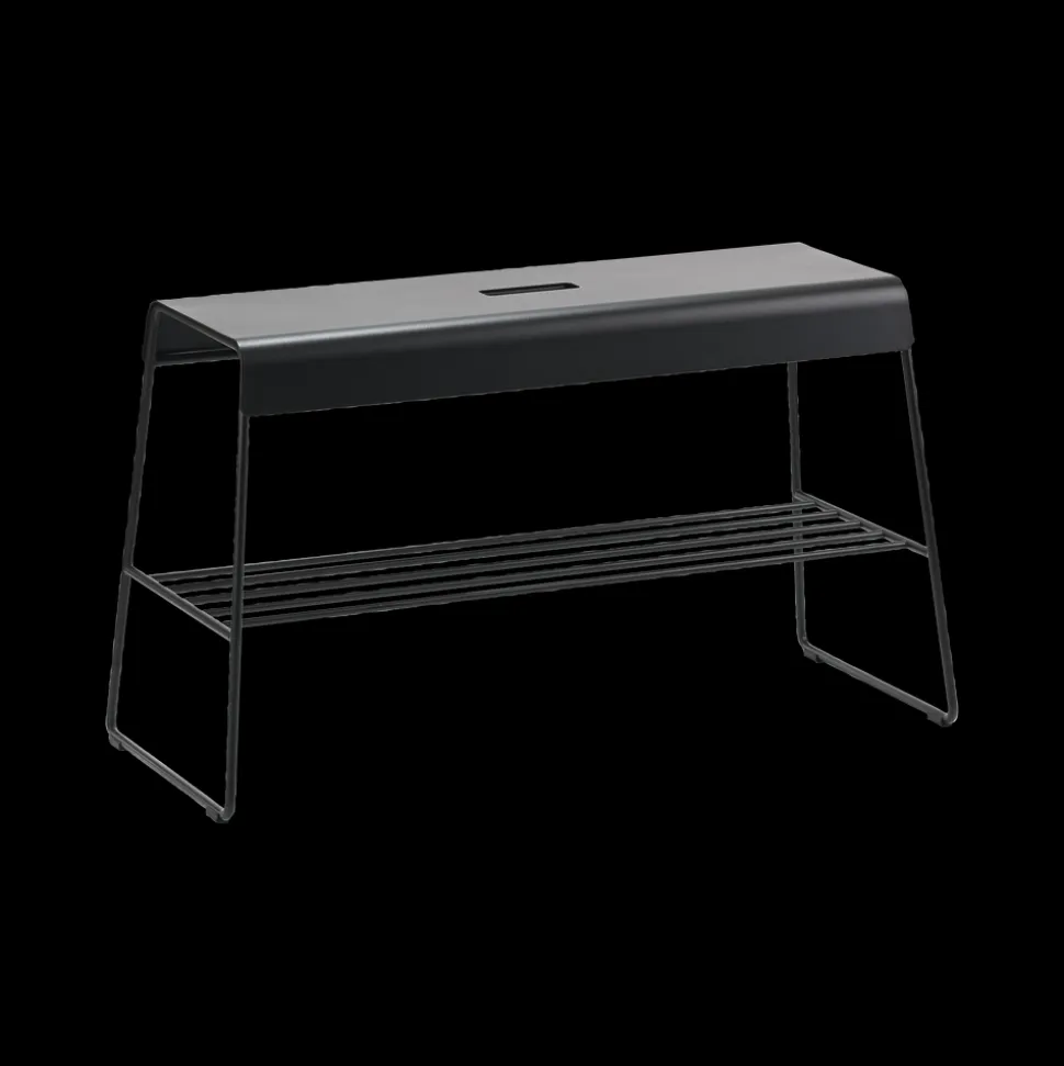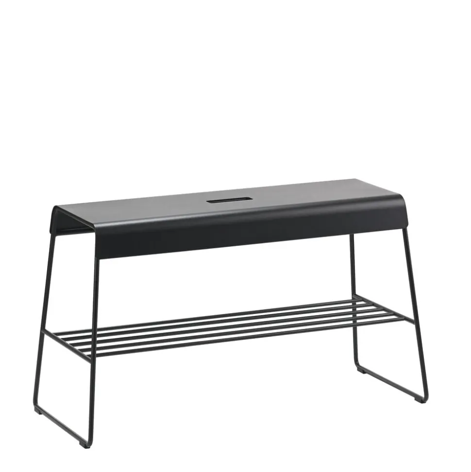 Den stilrene A-Bench i pulverlakeret stål har en praktisk hylde under sædet, hvilket gør den oplagt alle steder, hvor der er brug for lettere opbevaring. Det kan være til sko, huer og handsker i entreen eller til stearinlys og lanterner på terrassen. Stilen er minimalistisk, mulighederne mange. Tag plads og nyd et gennemtænkt design ude som inde.