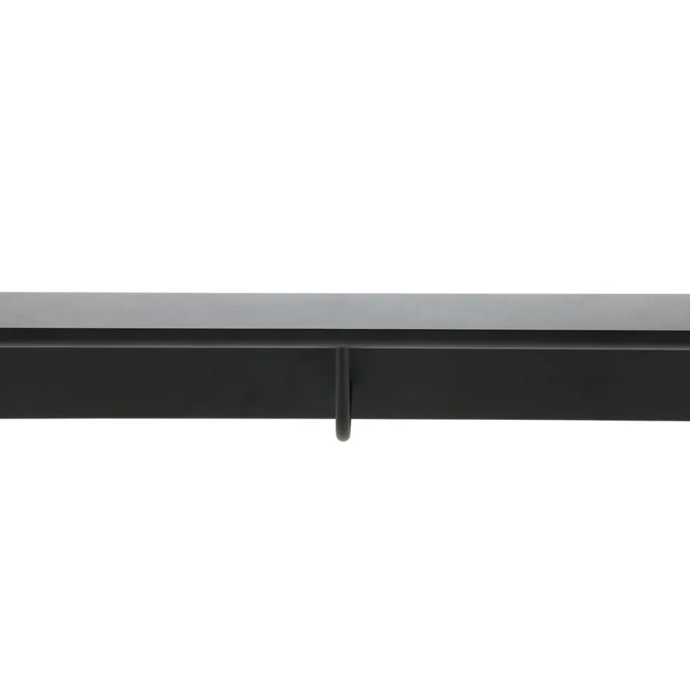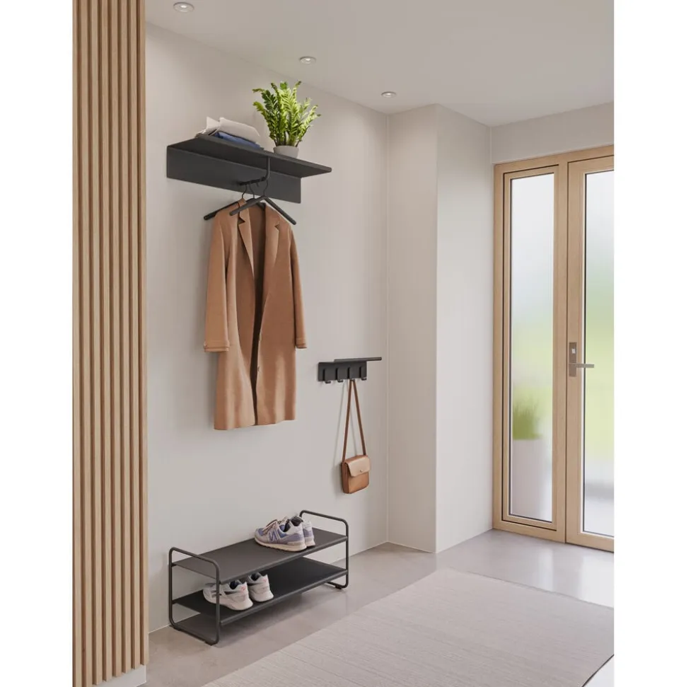 Minimalisme og funktion i smuk forening. Hattehylden fylder behageligt lidt i rummet. Den består af en tophylde med plads til huer, vanter, paraplyer m.v. Under hylden er en bøjlestang vinkelret monteret, så det ikke er skulderen på jakken, men fronten, der vender udad. Det giver et klædeligt udtryk i entréen. Afhængig af tykkelsen på overtøjet er der plads til 4-5 stykker. Takket være de medfølgende skjulte vægbeslag slipper du for synlige skruer. Udført i pulverlakeret stål.