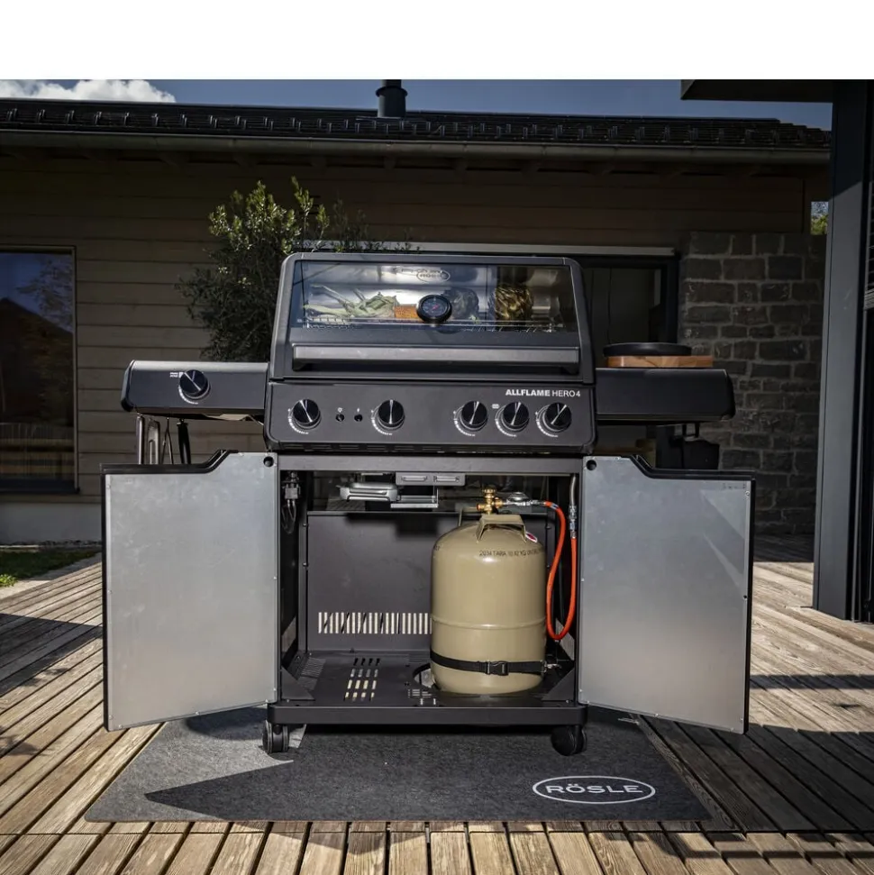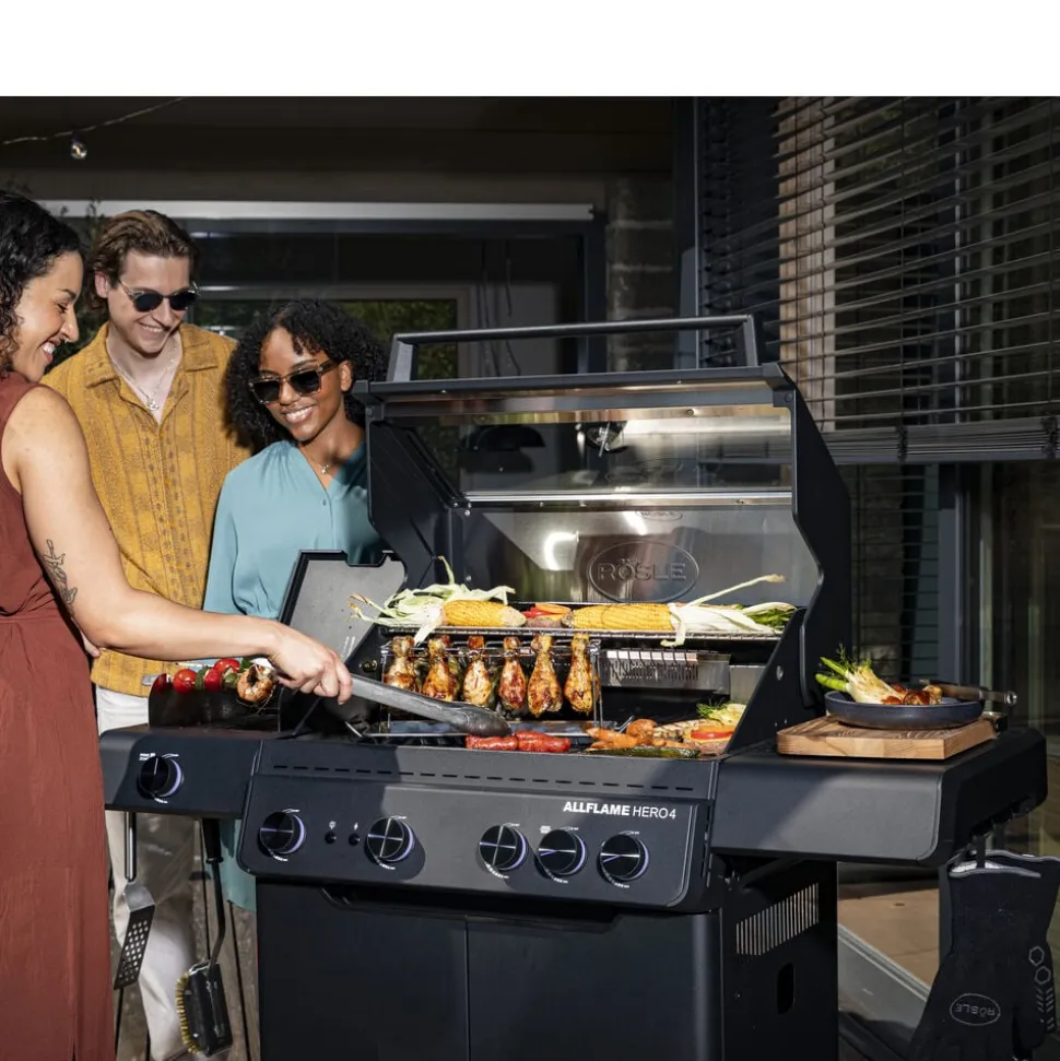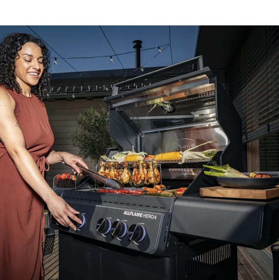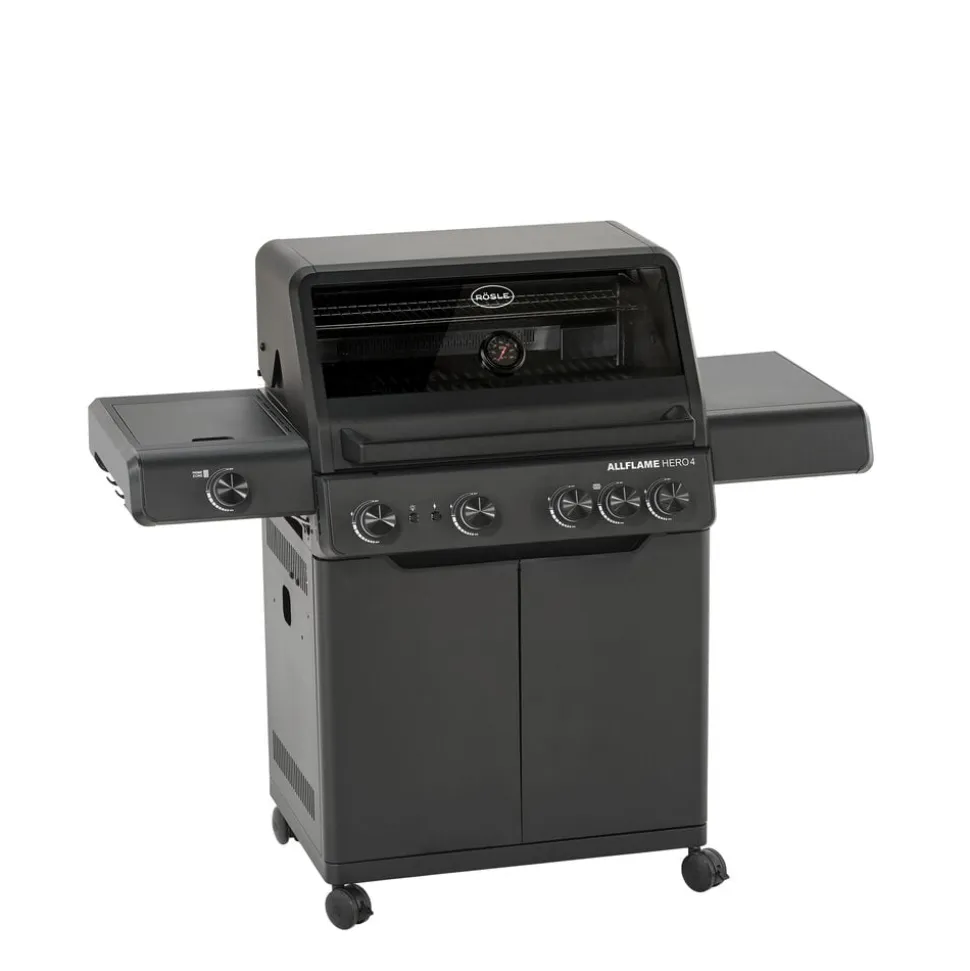 Der fås cover (varenr. 23917), rotisseri (varenr. 36098) og grillplade (varenr. 35569) til Rösle AllFlame Hero 4 gasgrill, som kan tilkøbes separat.