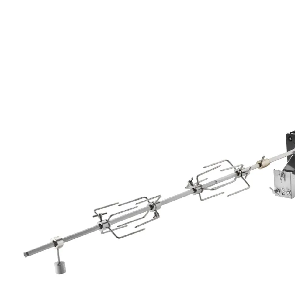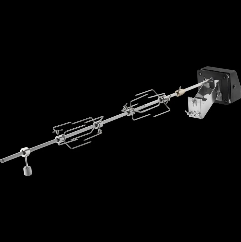 Rotisserie med ca. tre omdrejninger pr. minut, som sikrer sprødt kød udenpå og saftigt indeni. Det solide spyd i rustfrit stål kan klare op til 10 kg og er udstyret med fire holdere til sikker fastgørelse af kødet. Leveres med elmotor (230 V / 50 Hz) og passer til alle AllFlame-modeller fra Rösle.