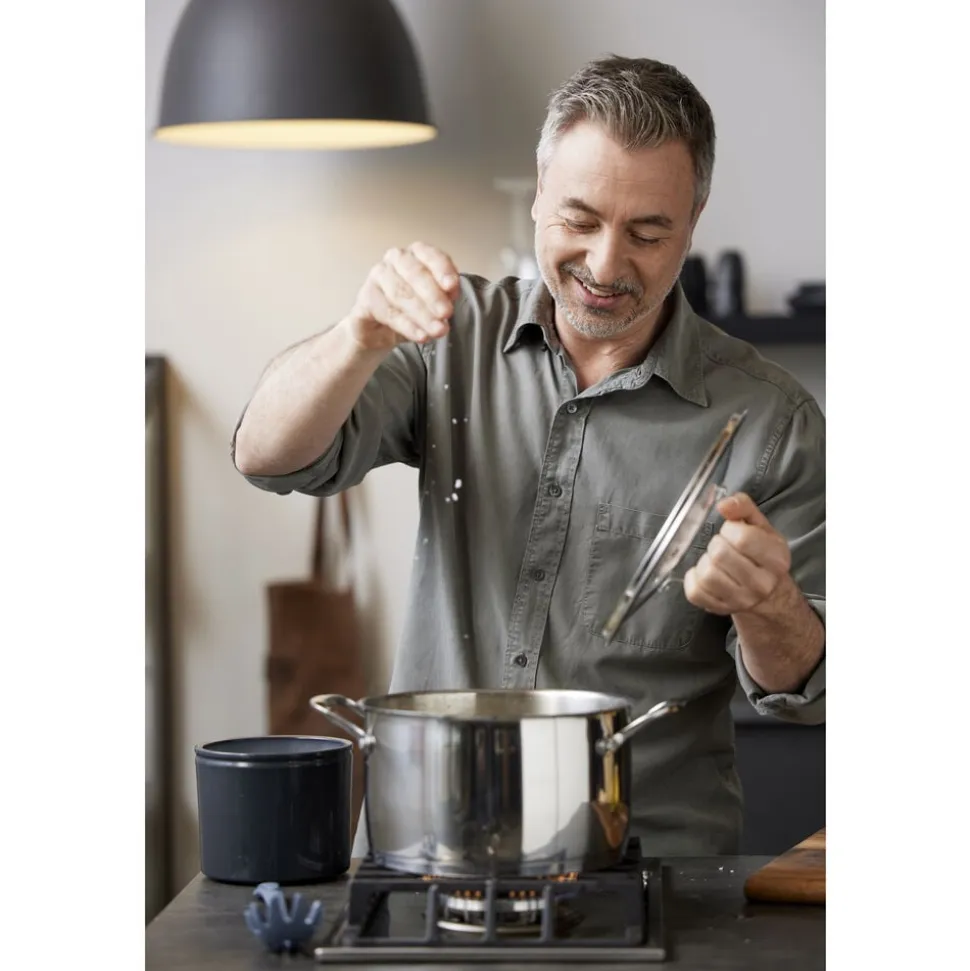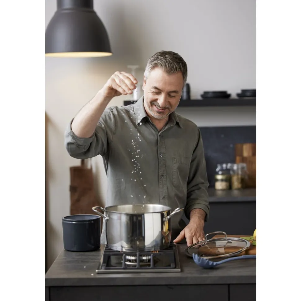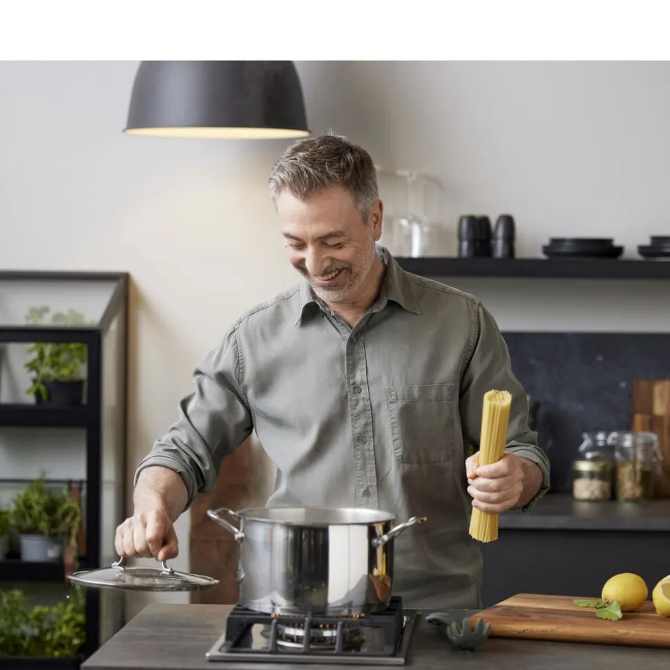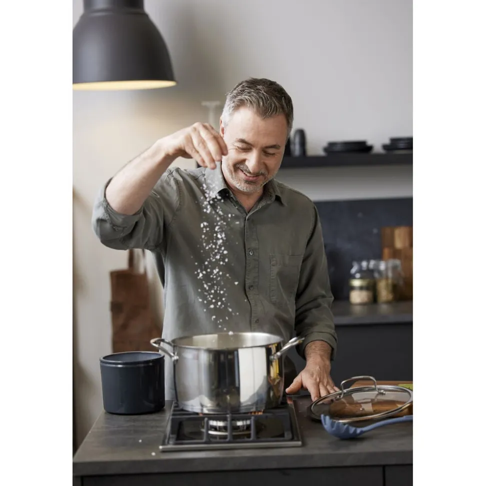 Gryde fremstillet i satinpoleret rustfrit stål. Bunden har en aluminiumkerne, som sikrer, at varmen fordeles jævnt og effektivt. Gryden er velegnet til alle varmekilder, tåler op til 220 grader C i ovnen og kan gå i opvaskemaskinen. Gryden tåler alle typer redskaber, har tilhørende glaslåg og kan indeholde 6,2 liter.