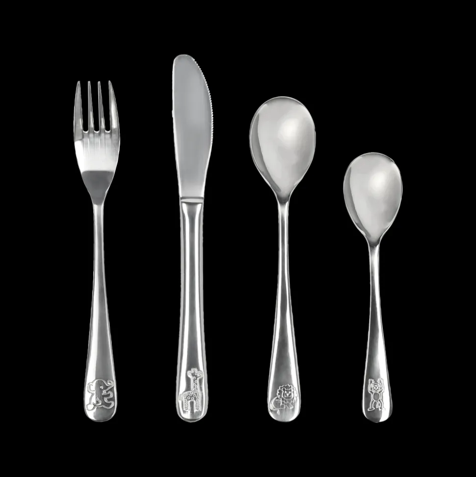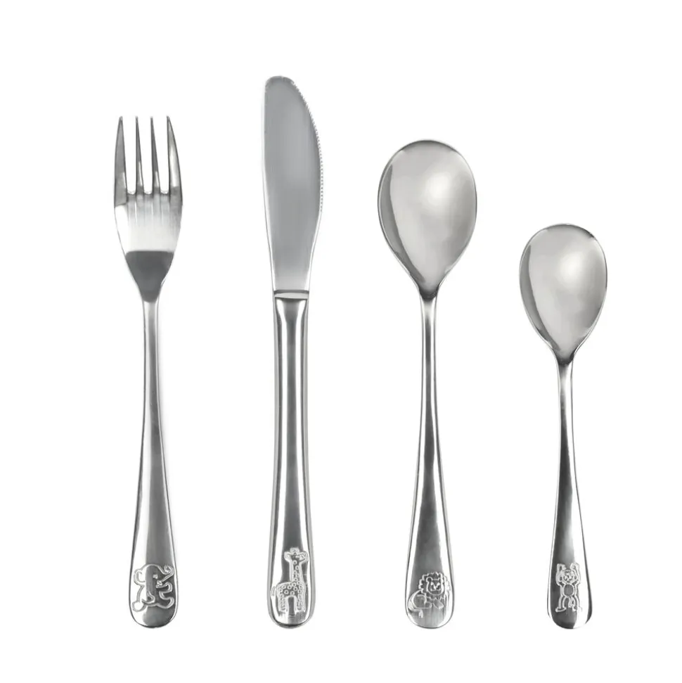 Børnebestik i blankt rustfrit stål med indgraverede dyr på skafterne.