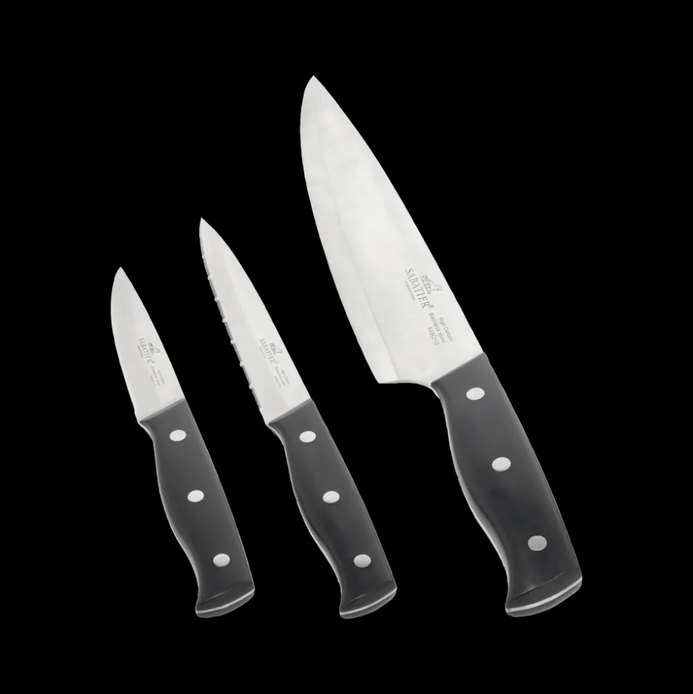 Lion Sabatier Austral er knive af rustfrit stål med skafter af sort ABS-plast. Urtekniv 9 cm, tomatkniv 13 cm, kokkekniv 20 cm.