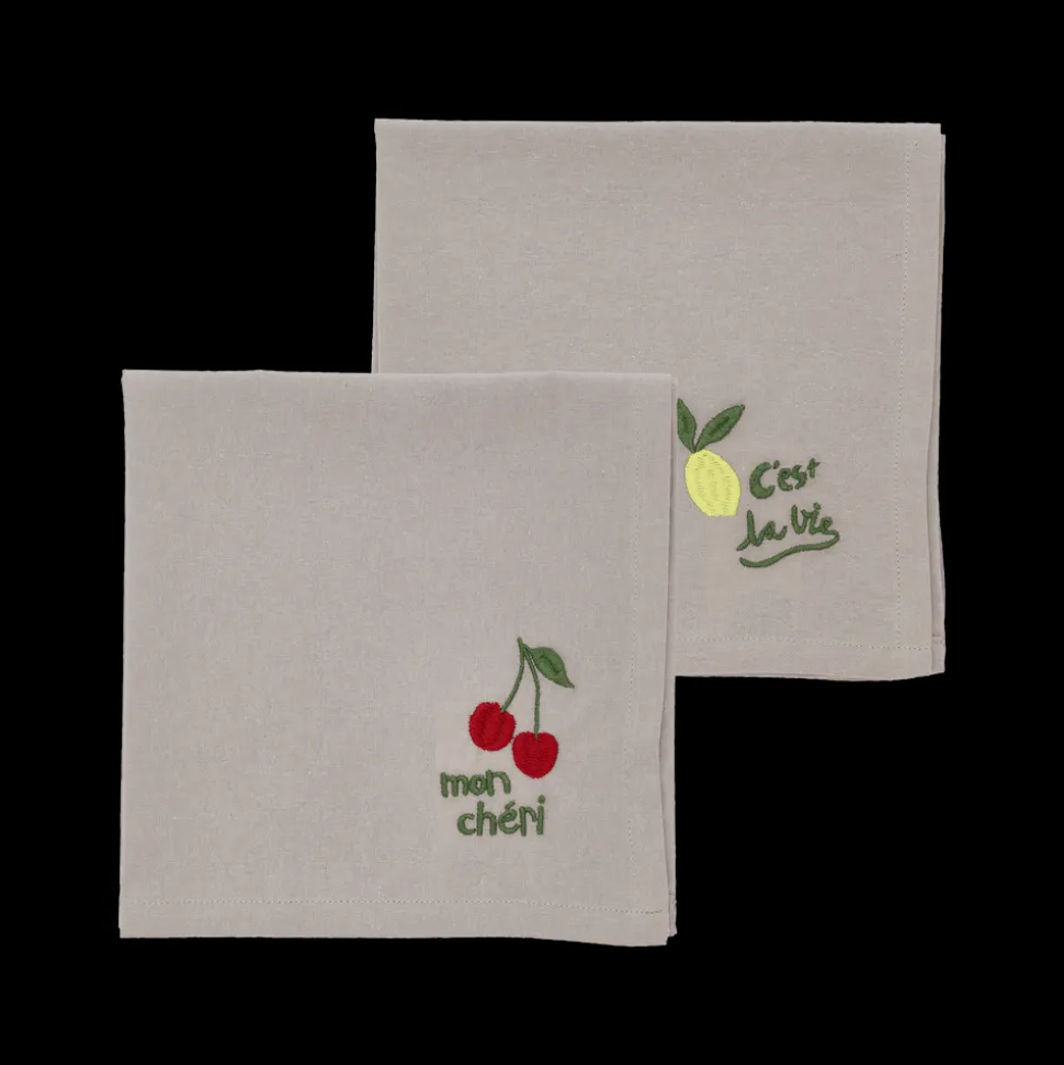 Dækkeservietter og servietter kommer i en pakke med to motiver. Hver serviet er dekoreret med skønne motiver af enten kirsebær, citroner, kaffekopper eller croissanter. Det neutrale stof fremhæver de livlige design og kombinerer holdbarhed med legende elegance.