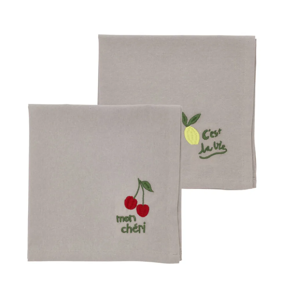 Dækkeservietterne har skønne broderier inspireret af klassiske café-motiver: kirsebær, citroner, kaffekopper og croissanter. Broderierne er farverige, og den neutrale farve i dækkeservietten skaber den perfekte baggrund, der lader de fine design træde frem.