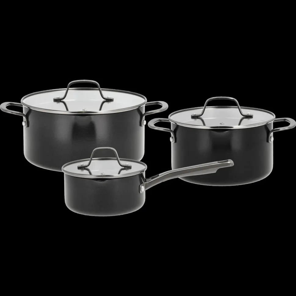 Grydesæt med 6 dele. Grydesættet består af en kasserolle på 1,5 liter (16 cm) samt gryder på 3,4 (20 cm) og 5,0 liter (24 cm), alle med glaslåg. Blavet-serien fra Pillivuyt Gourmet består af let og funktionelt kogegrej, der passer perfekt til madlavning i hverdag. Kroppen på seriens gryder og pander er fremstillet af 100 % genanvendt aluminium med sort keramisk belægning både indvendigt og udvendigt. Blavet-gryderne har måleskala på indersiden, hældetud og glaslåg med integreret si – så du f.eks. nemt kan hælde vand fra pasta og grøntsager. Blavet-gryderne er lette at håndtere og hurtige at opvarme, og den keramiske belægning på indersiden har en effektiv non-stick-effekt, som sikrer, at maden ikke brænder fast.