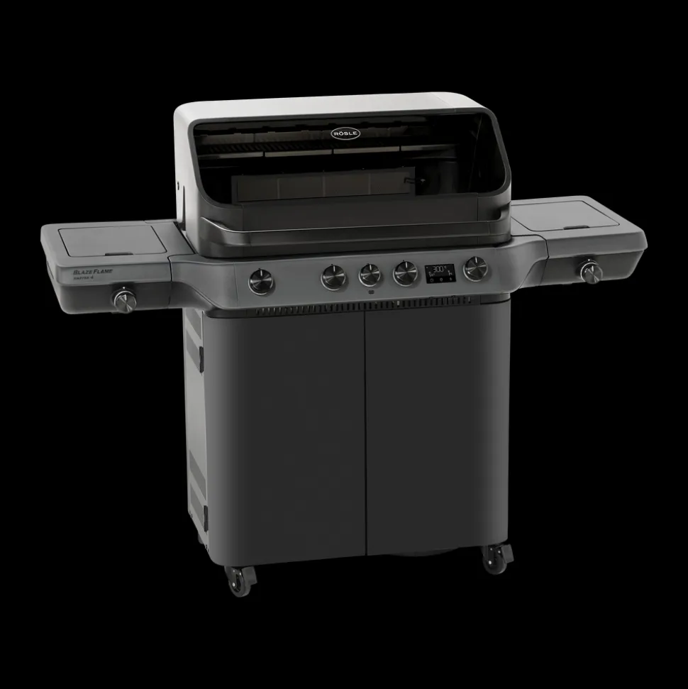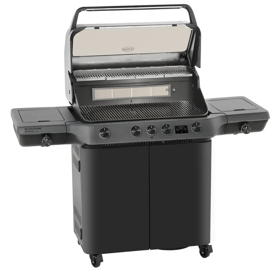 Blazeflame Master 4 er en kraftfuld gasgrill med fire imponerende gasbrændere (hver 4,0 kW), som nemt kan opnå høje temperaturer på grillristen i emaljeret støbejern. Grillen har et grillområde på 80 × 48 cm og fire justerbare opvarmningshylder. Opvarmningshylderne kan rengøres i opvaskemaskinen, og grillens smarte fedtopsamlingssystem med fire opsamlingsbakker sikrer nem og hygiejnisk rengøring. Opsamlingsbakkerne kan også rengøres i opvaskemaskinen. Brandkammeret er fremstillet i støbt aluminium, hvilket sikrer en optimal varmeeffektivitet og gør rengøringen ekstra nem. De fire brændere er samlet i én enhed, der nemt kan fjernes, når grillen skal rengøres. Der ydes 10 års garanti på brandkammeret.