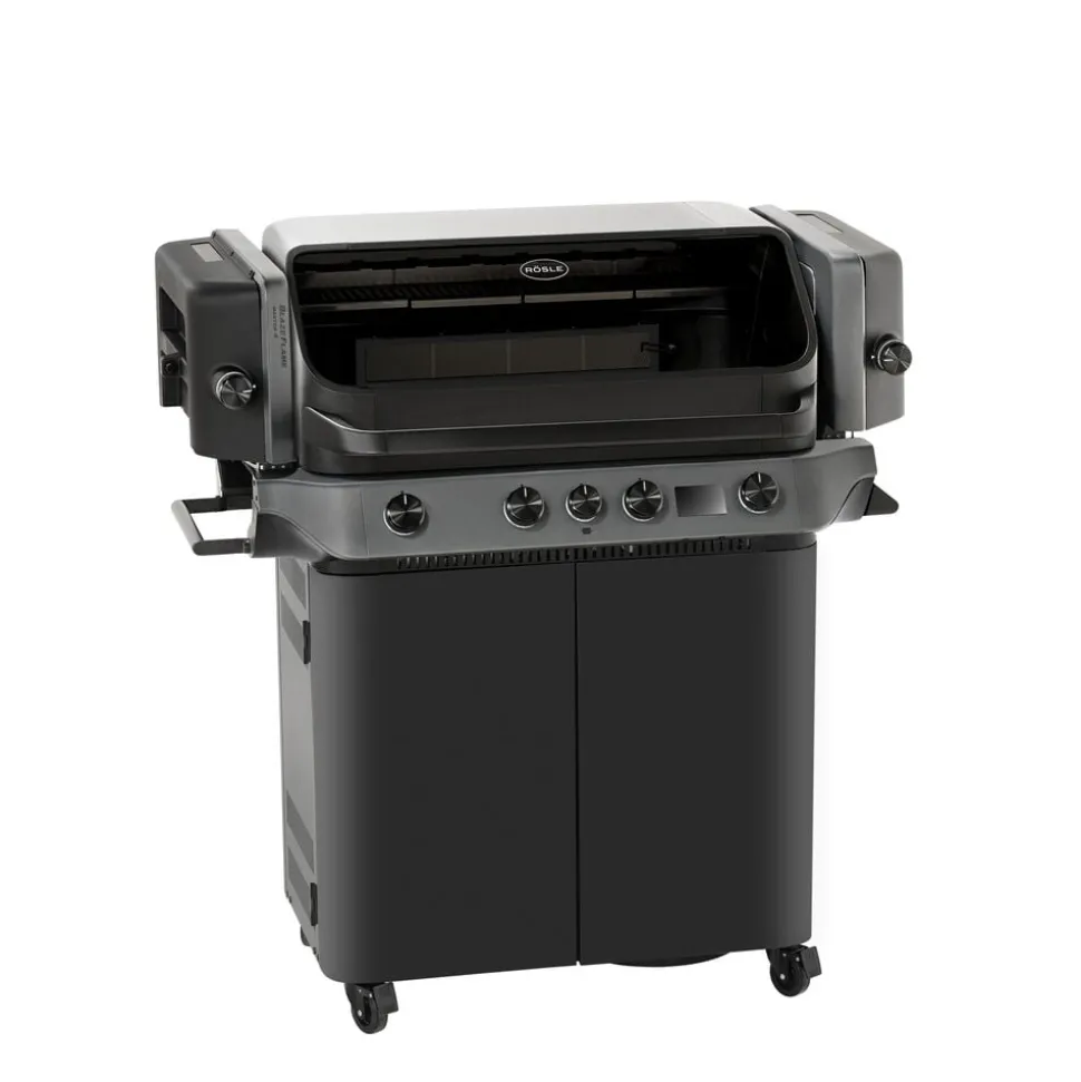 Blazeflame Master 4 har et stort panoramavindue med integreret lys, så du kan følge med i tilberedningen uden at åbne låget. De foldbare sideborde sparer plads, når grillen ikke er i brug, og de oplyste drejeknapper i to farver gør betjeningen intuitiv – selv efter mørkets frembrud. XXL-primezone med en ekstra kraftfuld og integreret sidebrænder (hele 5,0 kW) i det venstre sidebord når op til 800 °C, ideelt til lynstegning og intens varme. En praktisk kogeplade (3,5 kW) i det højre sidebord gør det nemt at tilberede saucer og tilbehør. Infrarød bagbrænder (4,6 kW) ideel ved brug af rotisseri.