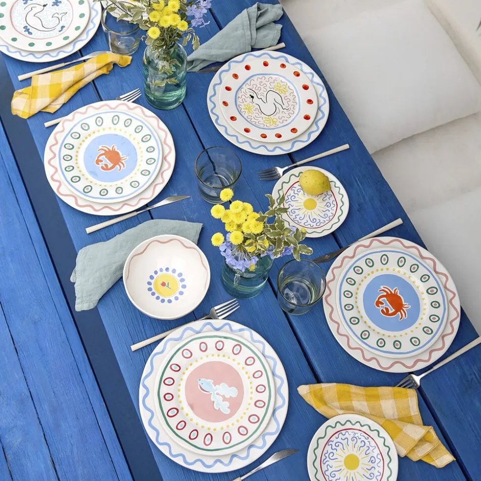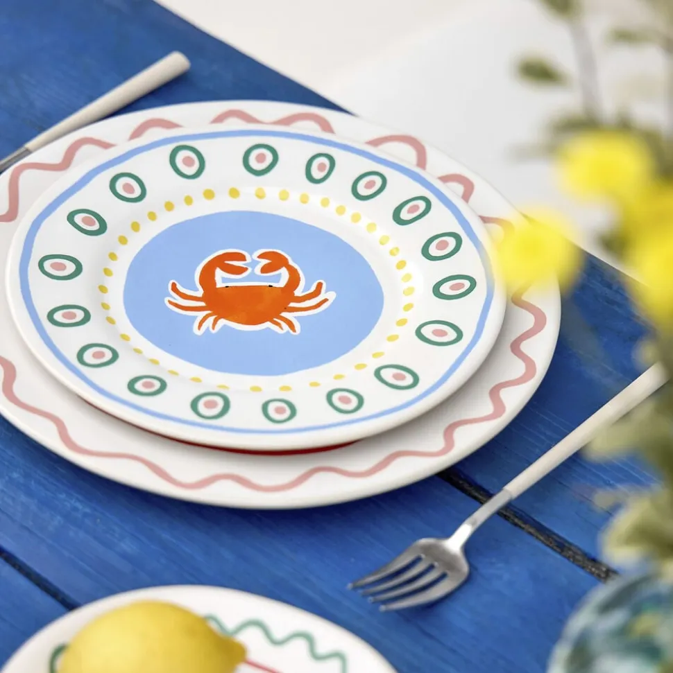 Tallerken, 22 cm. Tallerkenen lyser op med sin røde krabbe, som står i smuk kontrast til den lyseblå baggrund, og skaber en afslappet middelhavsstemning ved bordet. Perfekt til små serveringer, en frisk skaldyrsplatte eller en farverig morgenmad i solen.