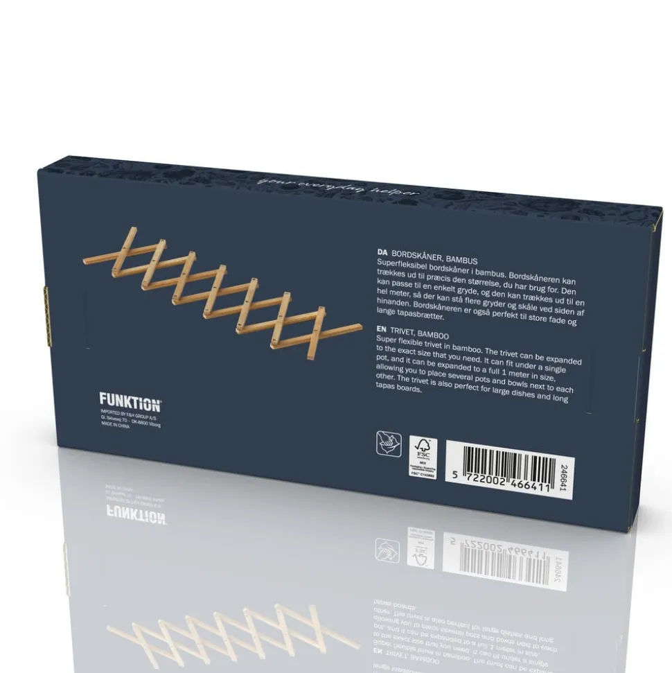 Superfleksibel bordskåner i bambus. Bordskåneren kan trækkes ud til præcis den størrelse, du har brug for. Den kan passe til en enkelt gryde, og den kan trækkes ud til 1 hel meter, så der kan stå flere gryder og skåle ved siden af hinanden. Bordskåneren er også perfekt til store fade og lange tapasbrætter.