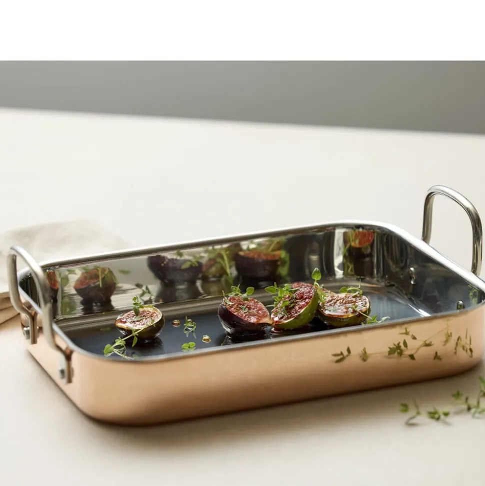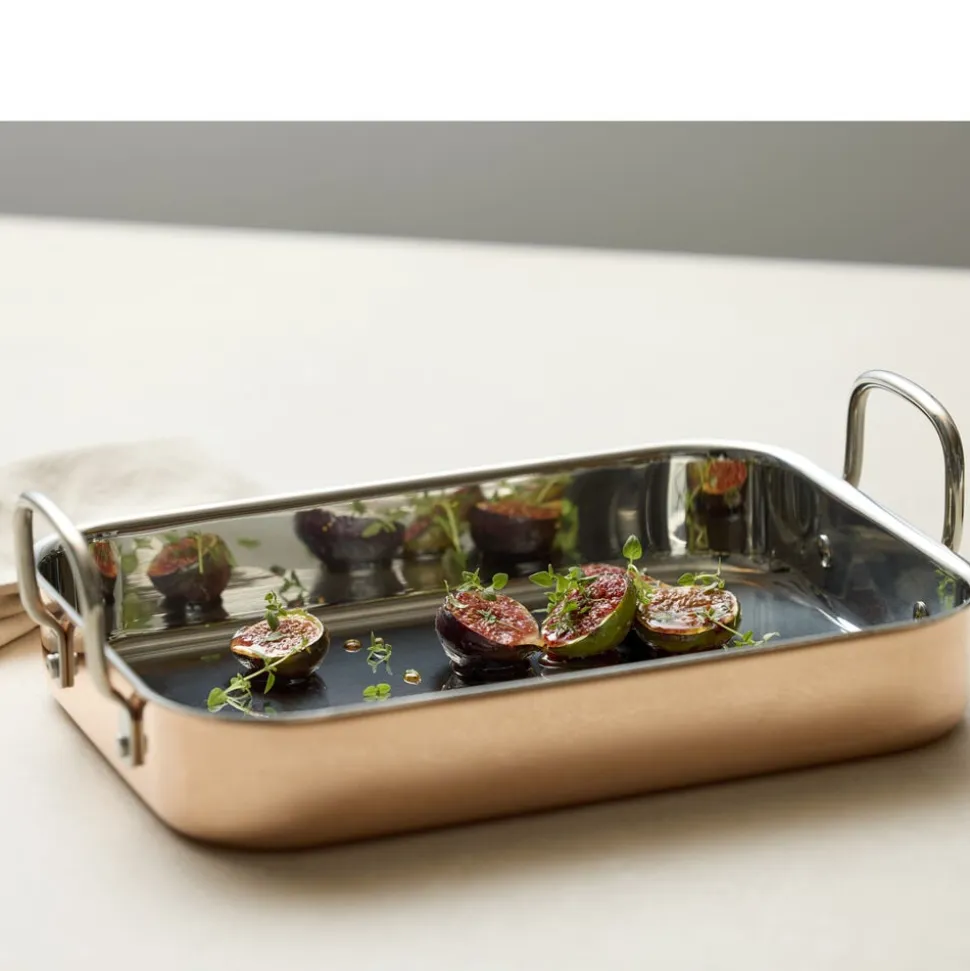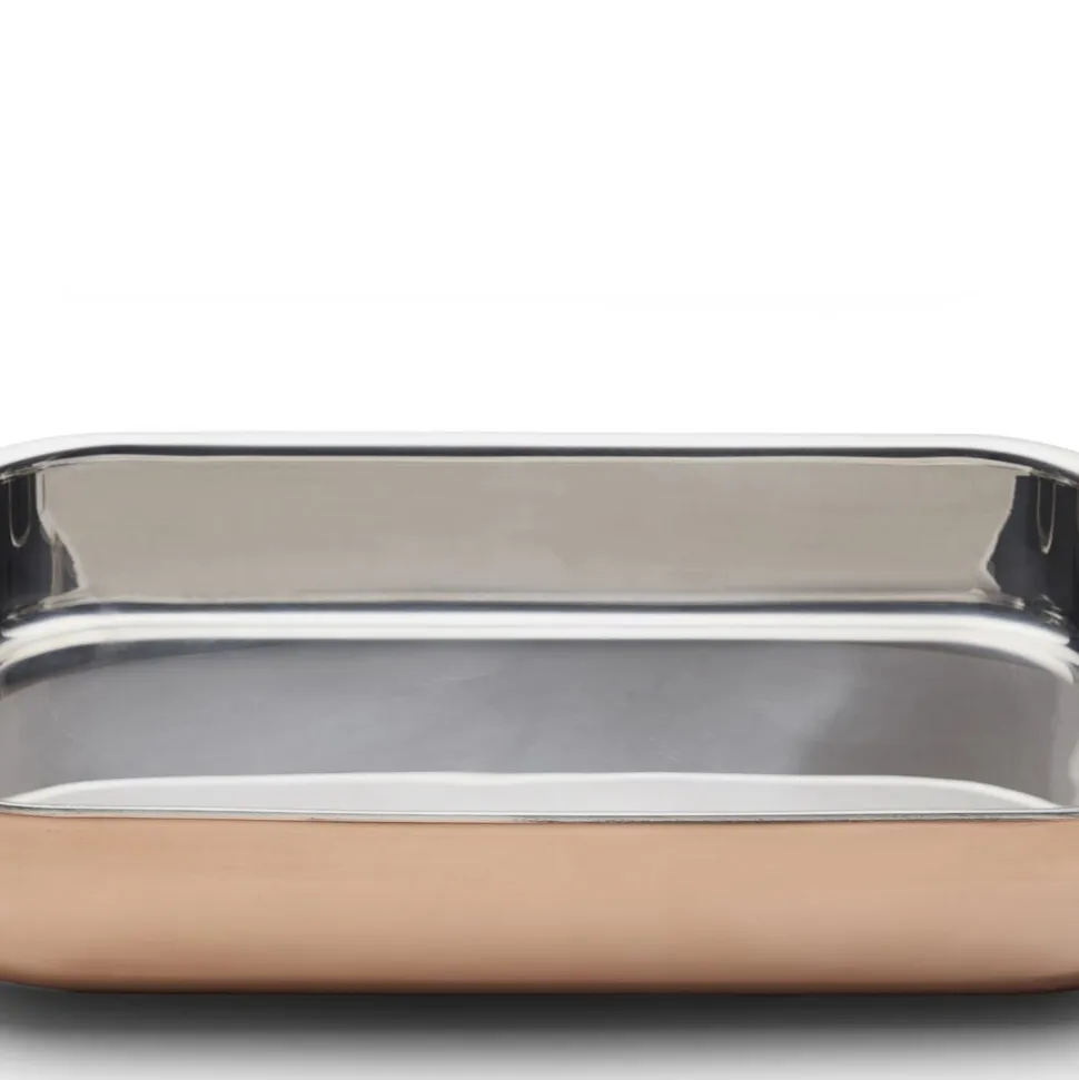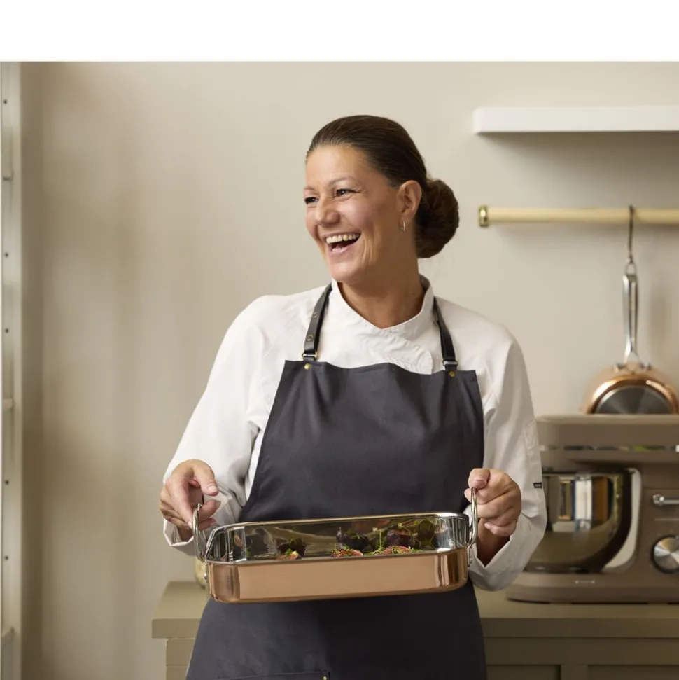 Tidløs, stilfuld og meget funktionel bradepande i kobber og rustfrit stål. Bradepanden er forsynet med håndtag i rustfrit stål. Tåler ovn op til 220 °C. Håndopvask med blød børste og sæbe anbefales. Brug af kobberpudsemiddel vil holde ydersiden blank.