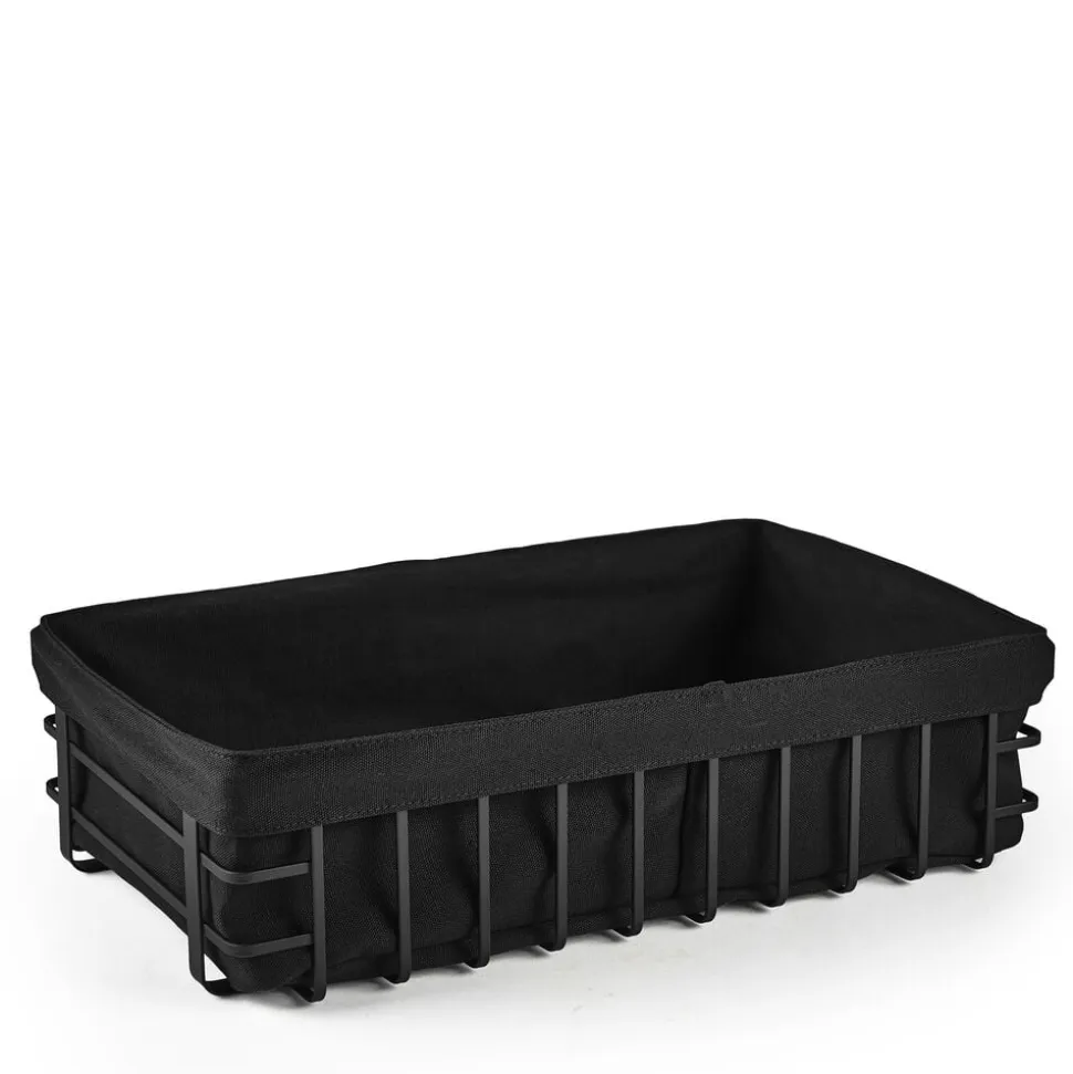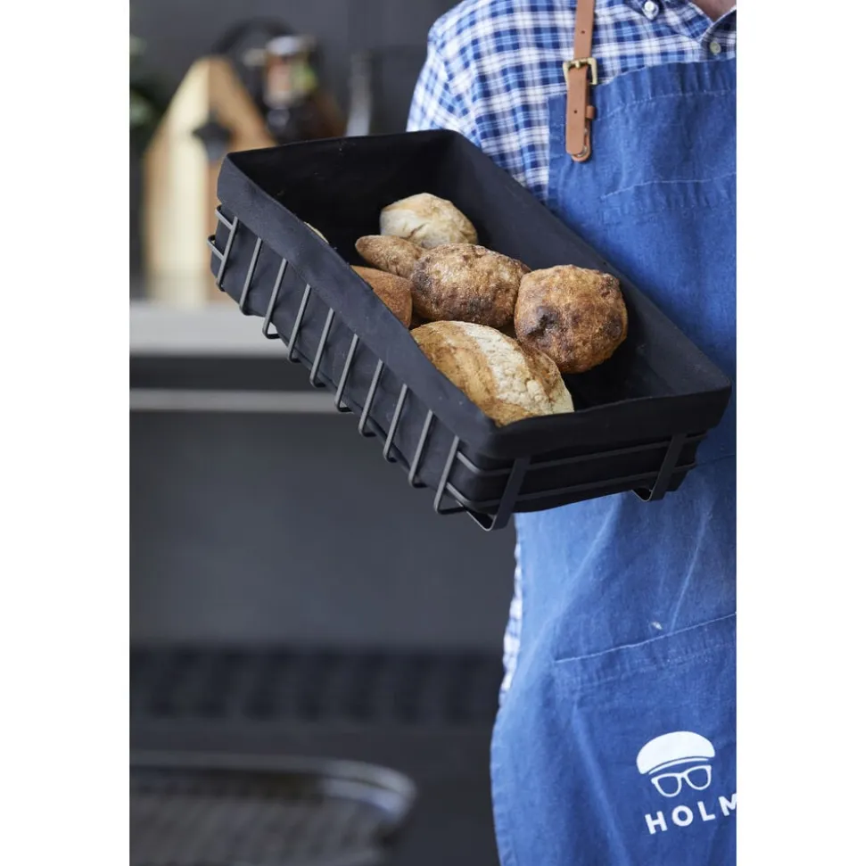 Byd morgenbrød og brødet til supper og salater rundt i en flot og rustik servering. Smart og rummelig brødkurv i mat, sort pulvercoated metal med sort stofpose i 100 % bomuld. 40 x 25 x 10 cm.