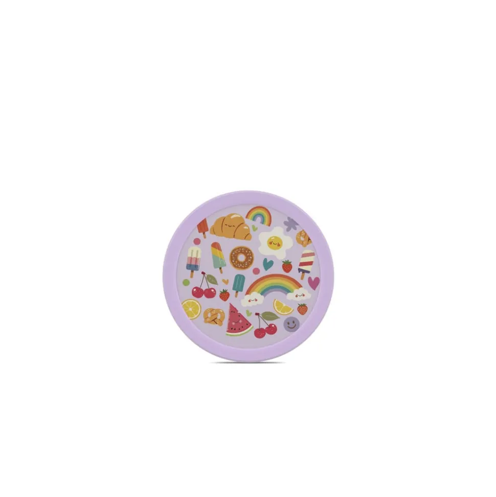 Mepals lille runde 300 ml Campus frugtboks med gaffel holder helt tæt og er nem for børnene at bruge. Boksen er ensfarvet med motiv på låget og fås med de samme motiver som de andre produkter i Mepals Campus-serie til børn. Frugtboksen kan vaskes i opvaskemaskine og kan (dog uden låg) anvendes i mikroovn. Fremstillet i Holland.
