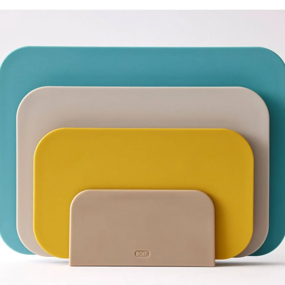 De tre størrelser er samme tykkelse og kan sagtens anvendes til servering og tages med ind på bordet til brød, pølse, oste og tapasanretninger med mere. Derfor er seriens fine farver valgt med grundig omtanke, og med sine venlige former bliver sættet et dekorativt supplement til din køkkenindretning.