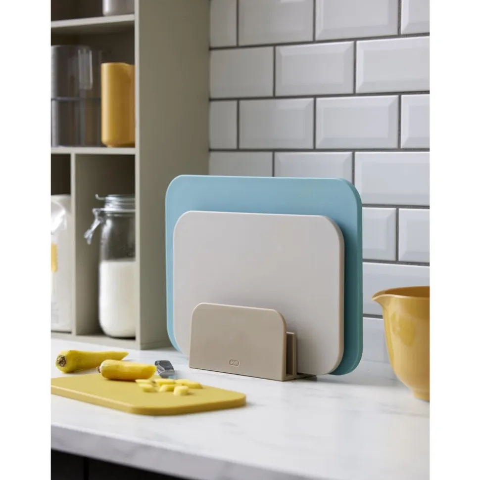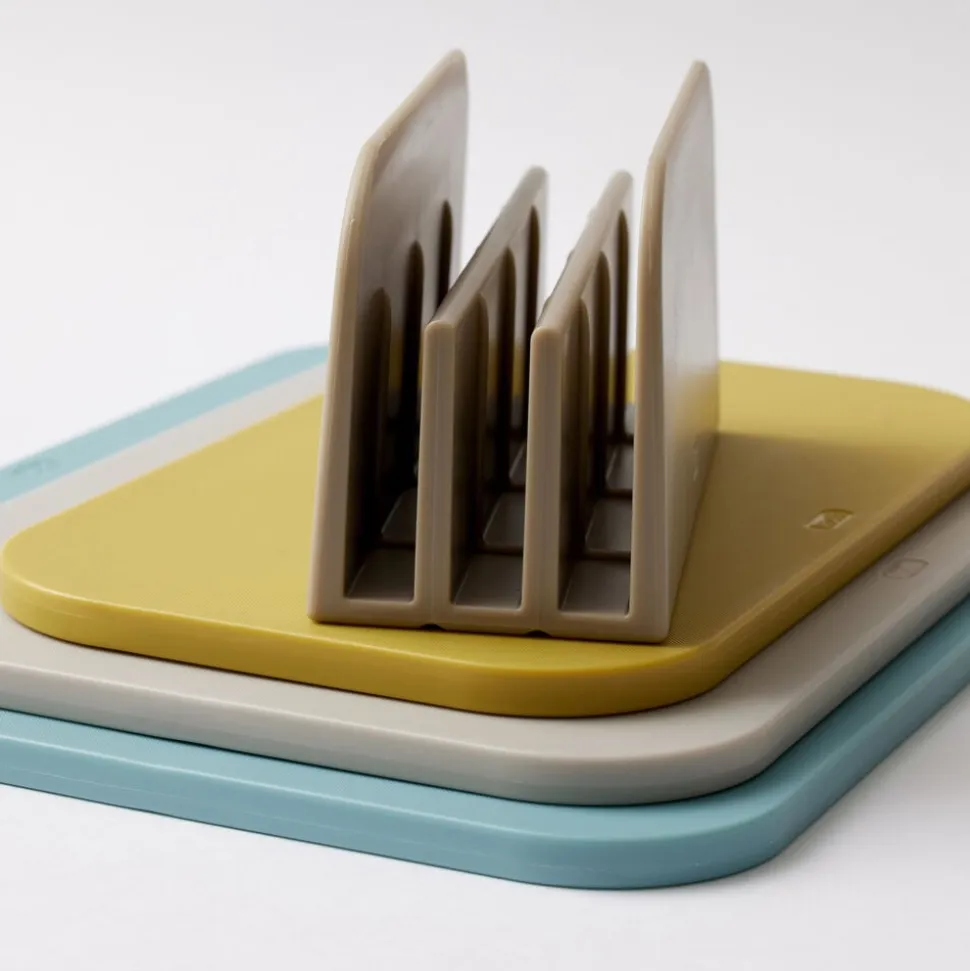 Sættet kommer med en smart holder med fokus på både opbevaring og hygiejne. Den holder skærebrætterne samlet, uden at de optager meget plads på køkkenbordet, og er udformet, så du kan sætte et fugtigt skærebræt direkte i holderen. Skærebrætterne står nemlig med lidt afstand til hinanden, og i bunden af holderen er der riller, som sikrer god ventilation og dermed hygiejne, f.eks. hvis brættet stadig er fugtigt, når det sættes på plads. Brætterne kan vaskes i opvaskemaskine.
