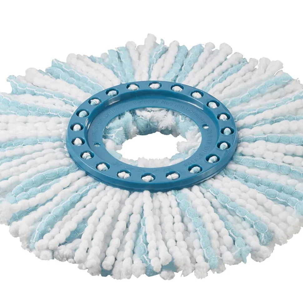 Rundt moppehoved i mikroduo, der gør rengøringen ekstra effektiv. De særlige turkise børster fjerner selv det mest genstridige snavs. Moppehovedet kan vaskes ved 60 °C.