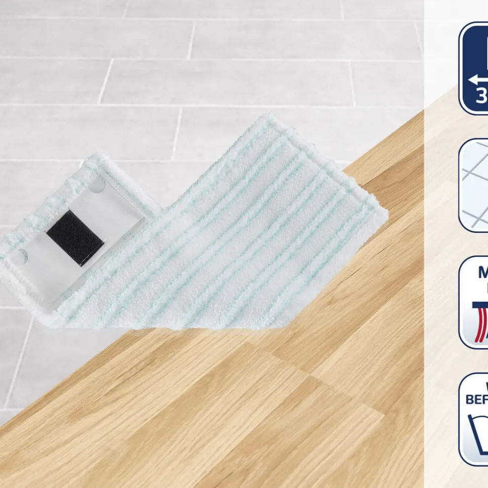 Moppeklud med dobbeltfibersystem til effektiv rengøring. De let forhøjede specialbørster fjerner snavs fra fuger og når ind i selv de mindste fordybninger på ujævne overflader, mens mikrofibrene opfanger alt snavs og vand. Kan vaskes ved 60 grader og bevarer sin høje rengøringsevne – selv efter mange vaske.