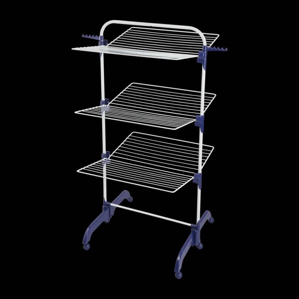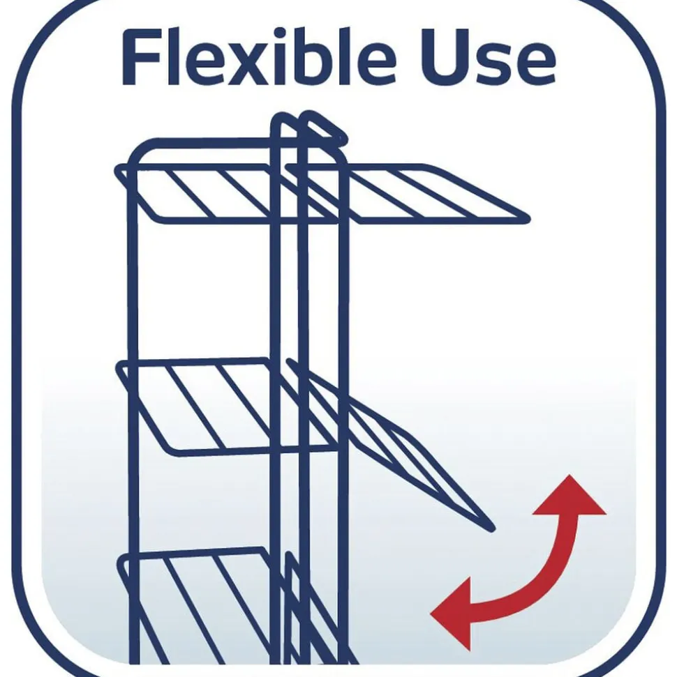 Comfort Tower 420 er et pladsbesparende tørrestativ, der udnytter højden og gør det nemt at tørre meget tøj på minimal gulvplads. Tørrestativet har tre fleksible tørreniveauer og i alt 42 meters tørreplads, og hver sektion kan klappes ned individuelt, så stativet også kan bruges op ad en væg eller radiator. Stativet er udstyret med to sidekroge, så du får ekstra ophæng til bluser og skjorter på bøjler. De seks 360° drejbare hjul gør det let at flytte stativet – selv når det er fuldt læsset – og når det ikke er i brug, kan det foldes fladt sammen og gemmes væk. 5 års garanti.