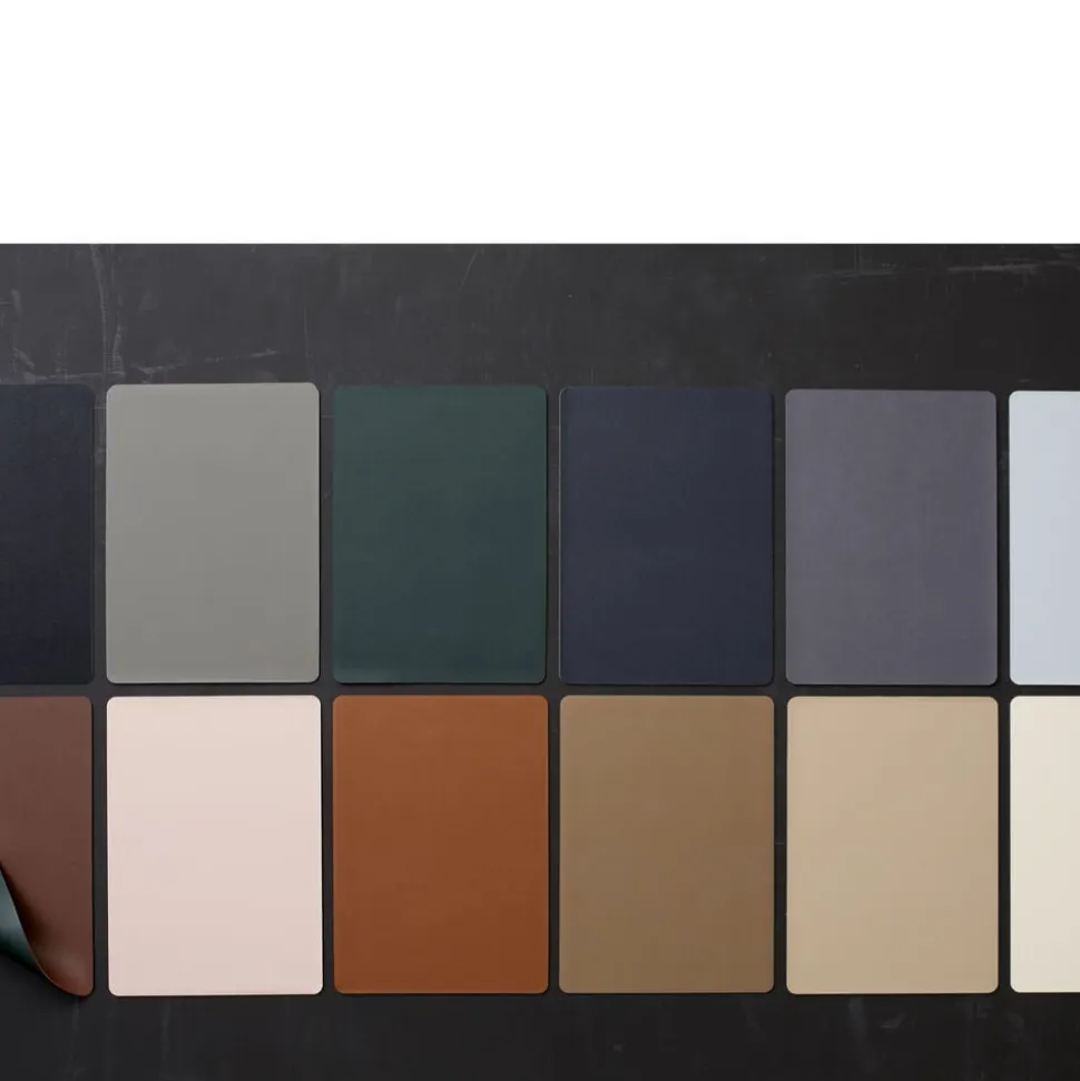 Vendbare dækkeservietter i praktisk vaskbart læderlook giver borddækningen et råt og moderne udtryk. Kongeblå/Sand.