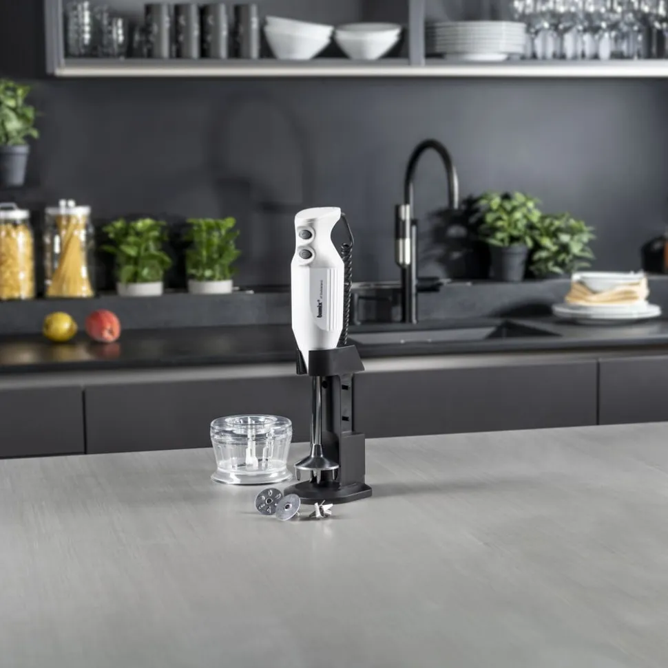 bamix® Deluxe-stavblender med en kraftig 200 watt motor, der sikrer pålidelig hjælp til selv de hårdeste opgaver i køkkenet. Stavblenderen har to hastighedsindstillinger og en praktisk ledning, der giver masser af fleksibilitet. Til produktet medfølger multifunktionskniv, blenderskive, piskeskive, kværn og bordstander samt en instruktionsmanual. Livstidsgaranti på motor.