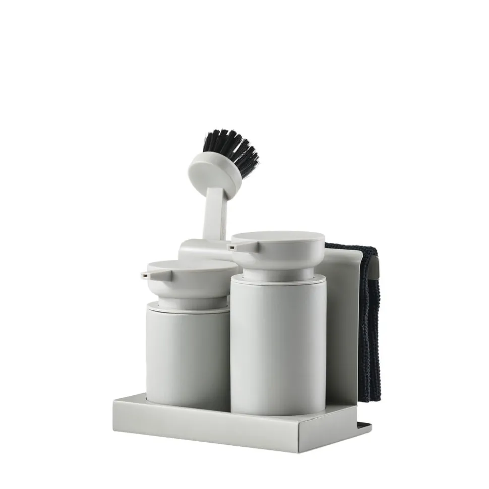 I front står dispenser-duoen til opvaskemiddel og håndsæbe/sprit. Begge dele er udført i keramik. Backstage hænger den strikkede karklud til tørre ganske uset, til den skal i brug. Den får selskab af børsten i matchende farve. En sidste fiks detalje er den lille bundbakke, der opsamler overskydende vand, så det ikke ender på køkkenbordet.