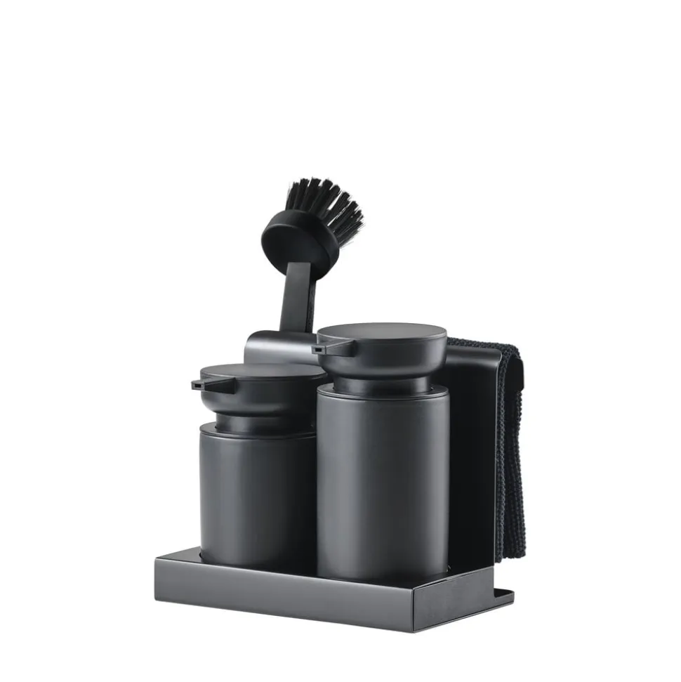 I front står dispenser-duoen til opvaskemiddel og håndsæbe/sprit. Begge dele er udført i keramik. Backstage hænger den strikkede karklud til tørre ganske uset, til den skal i brug. Den får selskab af børsten i matchende farve. En sidste fiks detalje er den lille bundbakke, der opsamler overskydende vand, så det ikke ender på køkkenbordet.