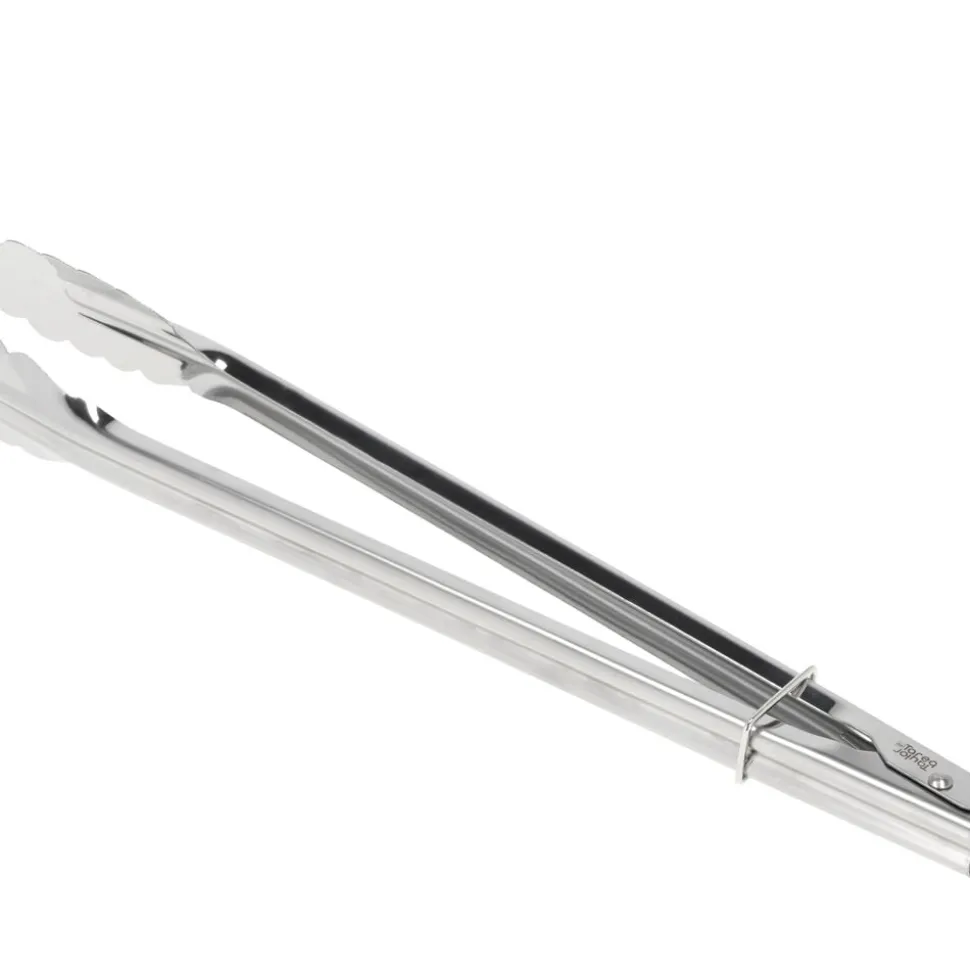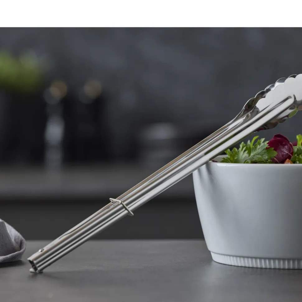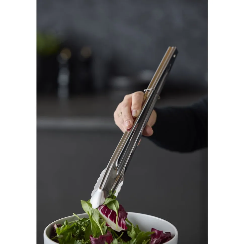 Den lange universaltang, 35,5 cm, i rustfrit stål har mange anvendelsesmuligheder. Brug den for eksempel til at løfte pasta med eller anvend den som salattang. Tangen har fjeder i toppen, og armene kan låses sammen, så tangen fylder mindre i skuffen.