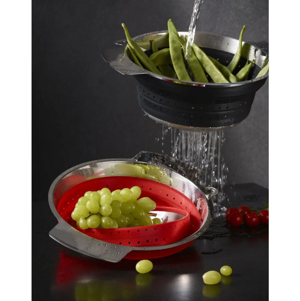 RÖSLE dørslag til grøntsager, pasta og meget andet. De mange små huller i bund og sider sikrer en hurtig og effektiv dræning. Dørslaget er designet til at stå stabilt på bordet, når det ikke er i brug. Sider af silikone gør det muligt at folde dørslaget til en højde på kun 4 cm, så du kan opbevare det pladsbesparende. Tåler opvaskemaskine