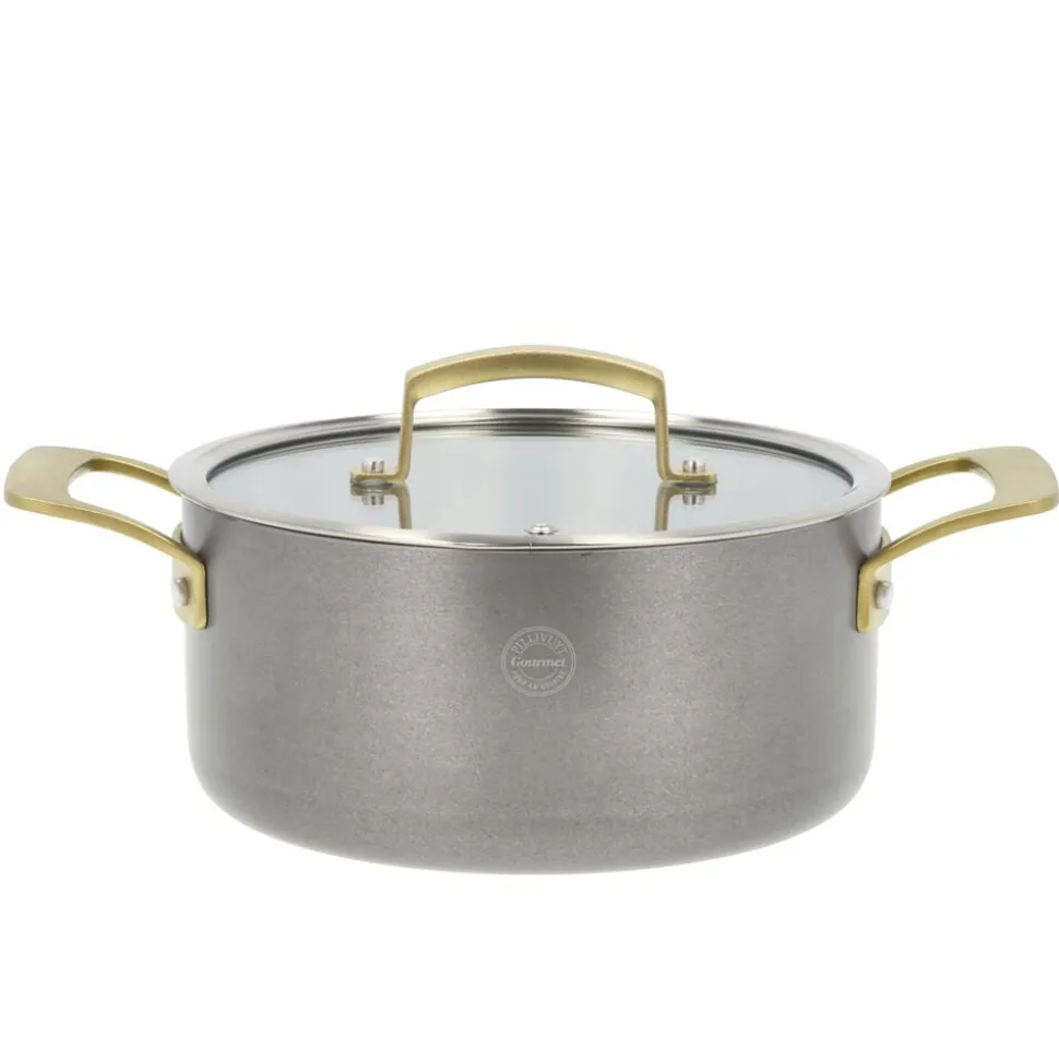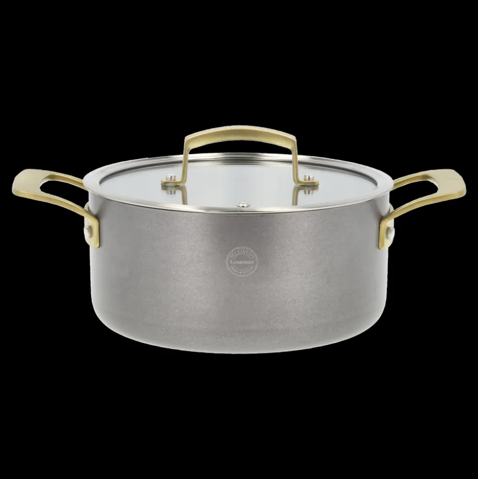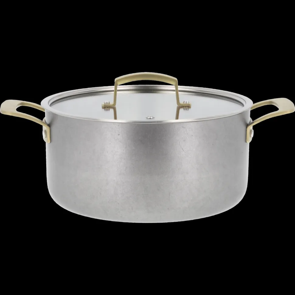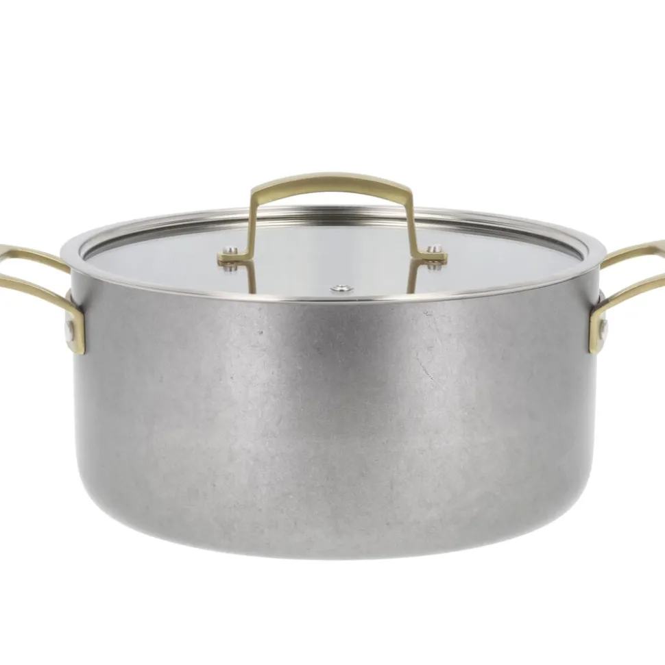 Fremstillet af 18/10 rustfrit stål med en kraftig 2,5 mm 3-lags konstruktion af rustfrit stål, aluminium og rustfrit stål. Mellemlaget af aluminium sikrer optimal varmefordeling. Pånittede støbte stålhåndtag, som er PVD-forgyldt. Ydersiden har en vintage polering. Glaslåg med damphul. Målestreger indvendigt på kasseroller og gryder. Passer til alle varmekilder inkl. induktion. Håndopvask anbefales.