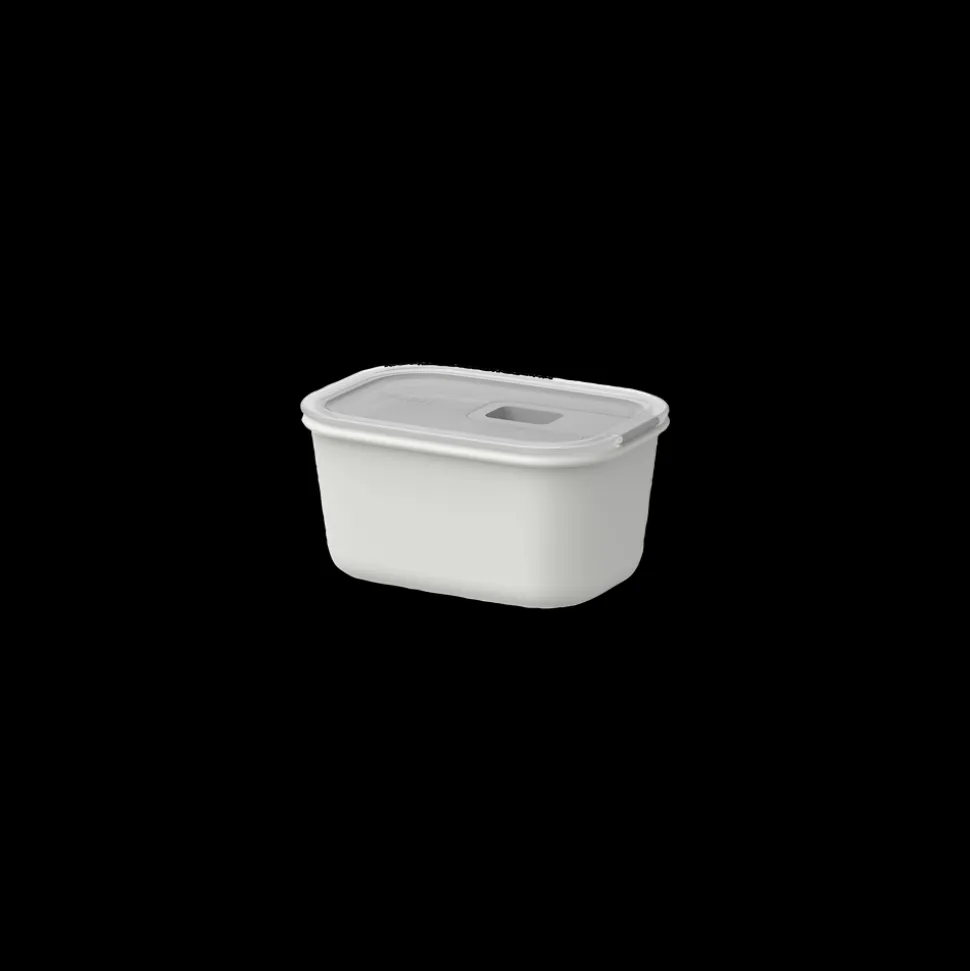 Sæt låget på og luk klipsen. Når du hører klikket, er boksen helt lukket og læk-, luft- og aromatæt. Lågets klips fungerer også som ventil, når boksen bruges i mikroovn. Tætningsringen på låget kan fjernes for nemmere og mere hygiejnisk rengøring.