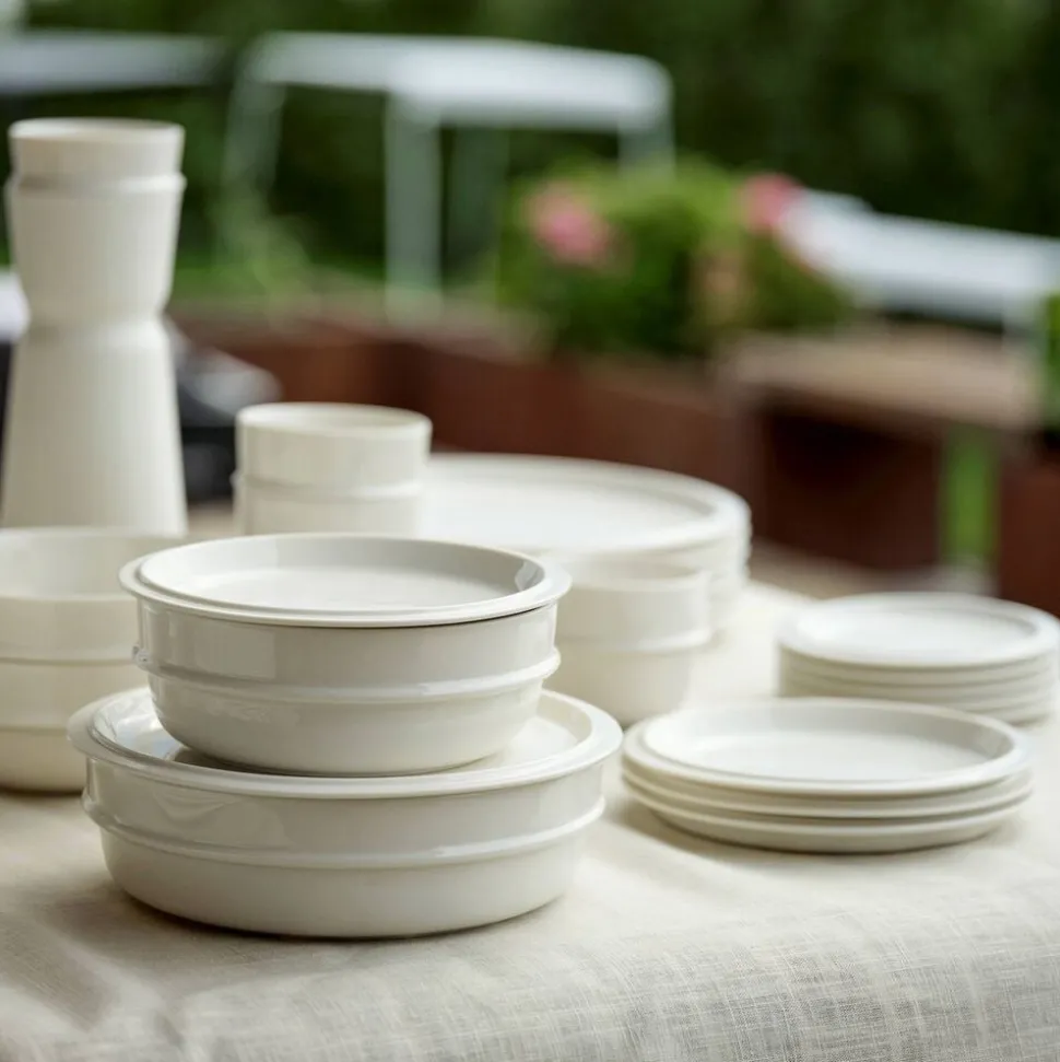 Serviceserien Eau er et godt bud på en moderne klassiker. Udtrykket enkelt og imødekommende, og alt overflødigt er skåret væk. Du kan stable kopper, skåle og tallerkener sikkert, hvilket selvsagt letter borddækning og afrydning, men også optimerer pladsen i skabet. Desuden kan tallerkenerne fungere som låg til skålene. Samtidig betyder det, at du kan lave uhøjtidelige og charmerende buffet-opstillinger som i Sydeuropa, hvor tallerkenerne stakkes til høflig og hyggelig selvbetjening. Uanset om du inviterer på tapas i hjemmet, kagebuffet i haven eller spontan nabomiddag på villavejen. EAU-serien består af tallerkener og skåle i forskellige størrelser samt kop og karaffel. Porcelænet i serien er udført i den klassiske og lækre nuance offwhite.