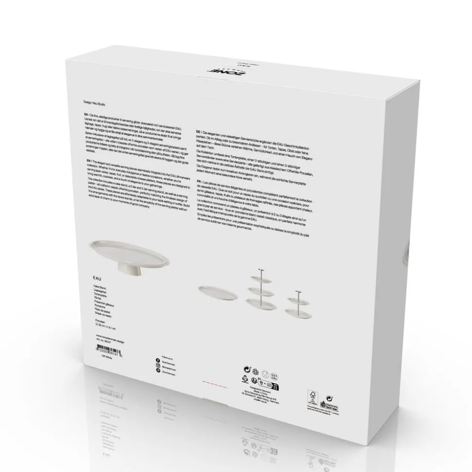 Eau-serien er udført i klassisk offwhite porcelæn, og produkterne er tidløse og lette at integrere i din borddækning eller på buffeten. Så byg fine anretninger i højden, eller lad det enkle serveringsfad give lidt ekstra til hyggen og det gode selskab.