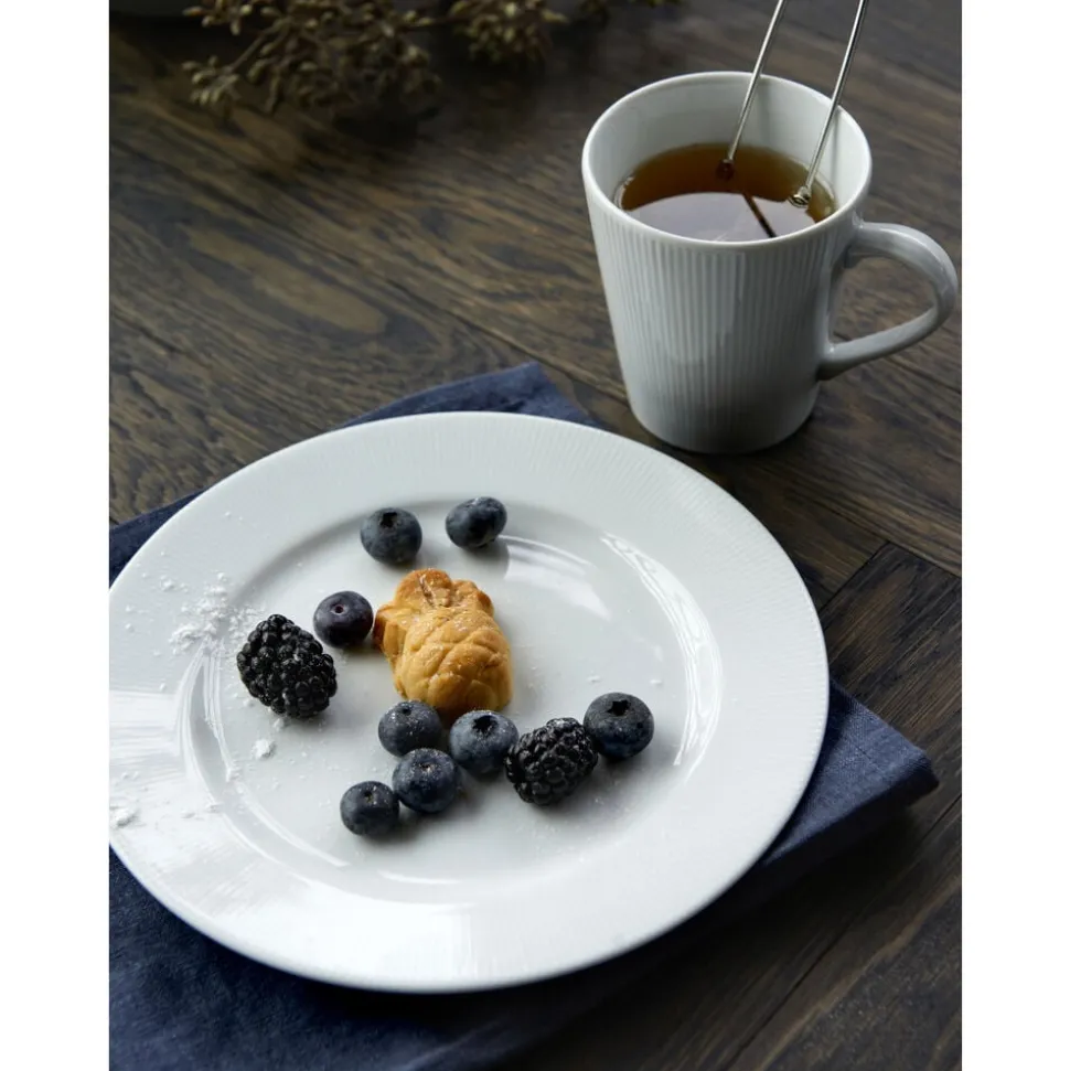 Eventail flad tallerken med fane, 22 cm. Velegnet som frokosttallerken eller desserttallerken. Træd ind i en fortryllende verden med Eventail – et betagende stel prydet af et forførende mønster, der leder tankerne hen på elegante vifter. Med sin legende og sofistikerede udstråling tilføjer Eventail en sublim æstetik til dit måltid. Dette sande kunstværk hæver din spiseoplevelse til nye højder.