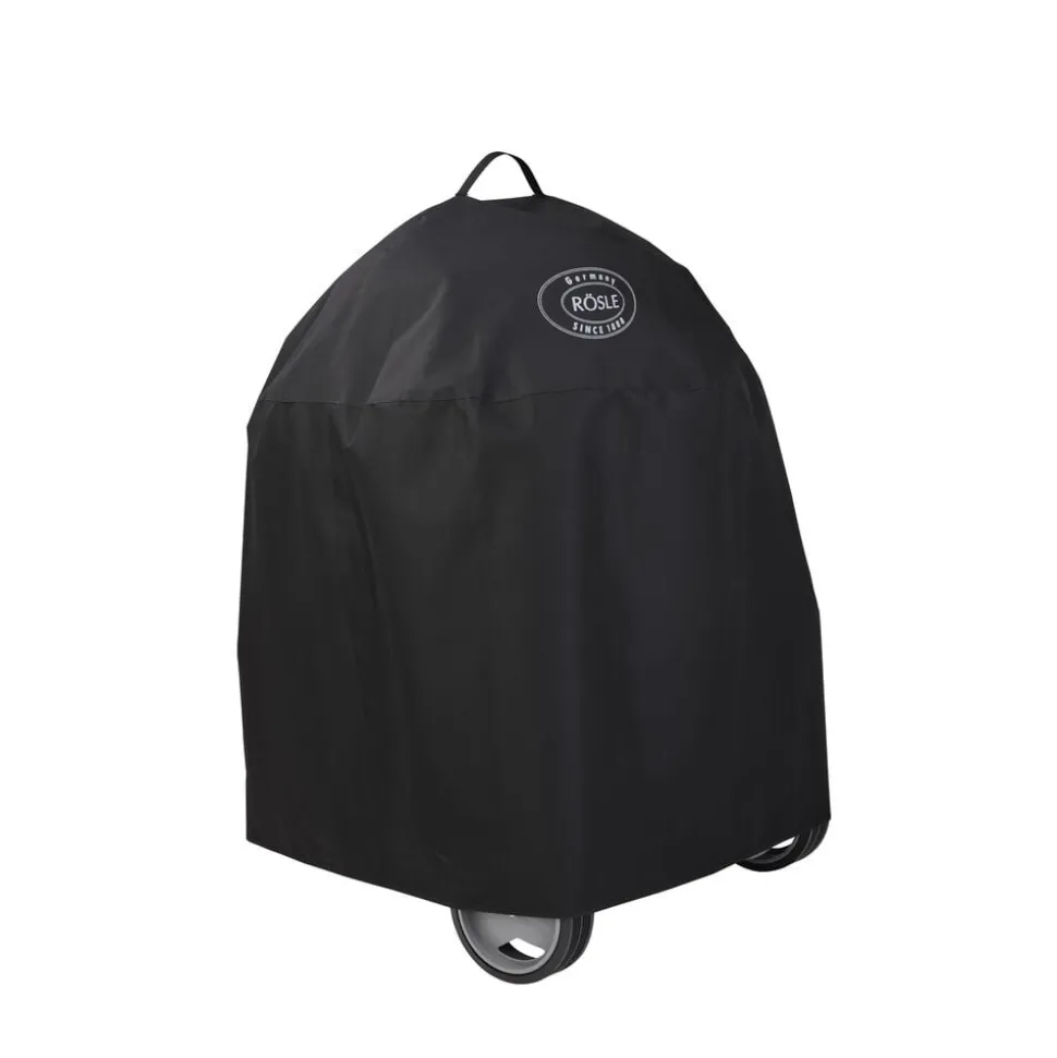 Det sorte, vandtætte grillcover er designet til at passe til Rösles kulgrill No.1 F50 Air. Coveret har velcrolukning til fastgørelse på grillrammen.