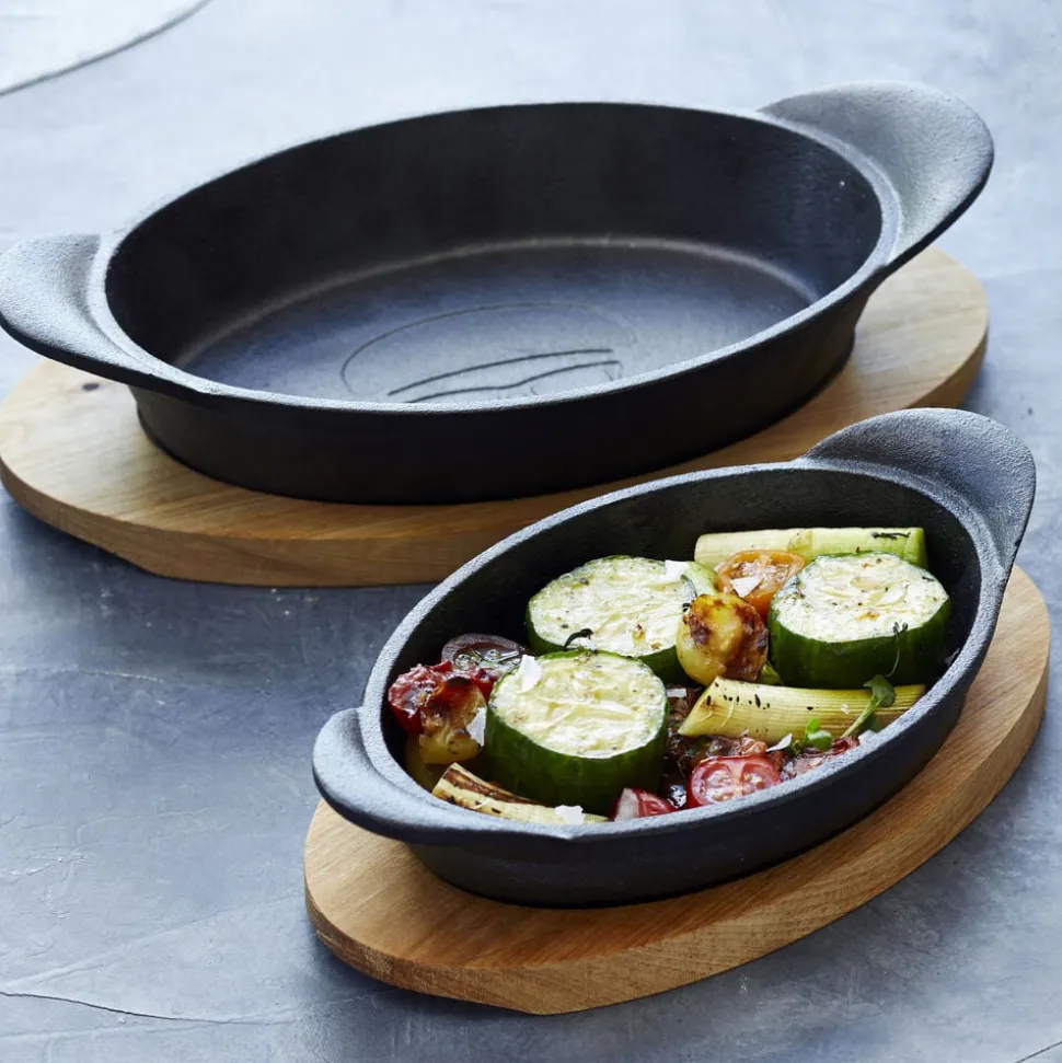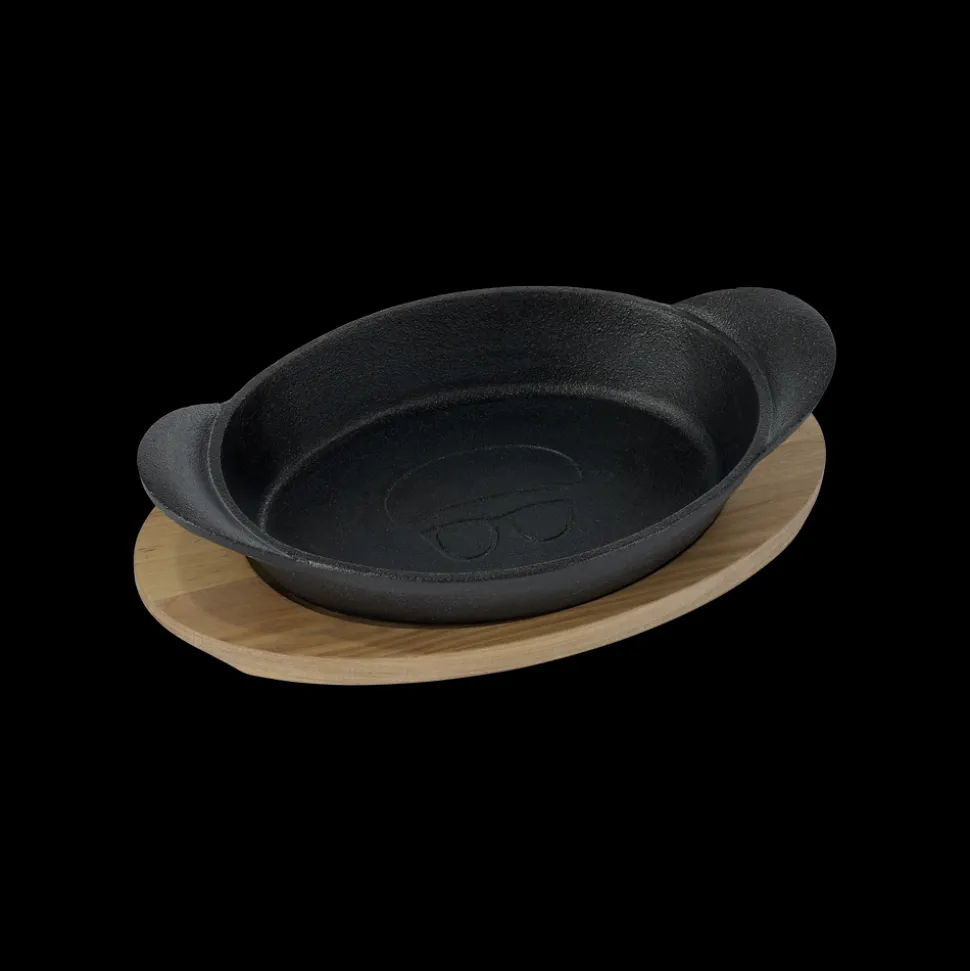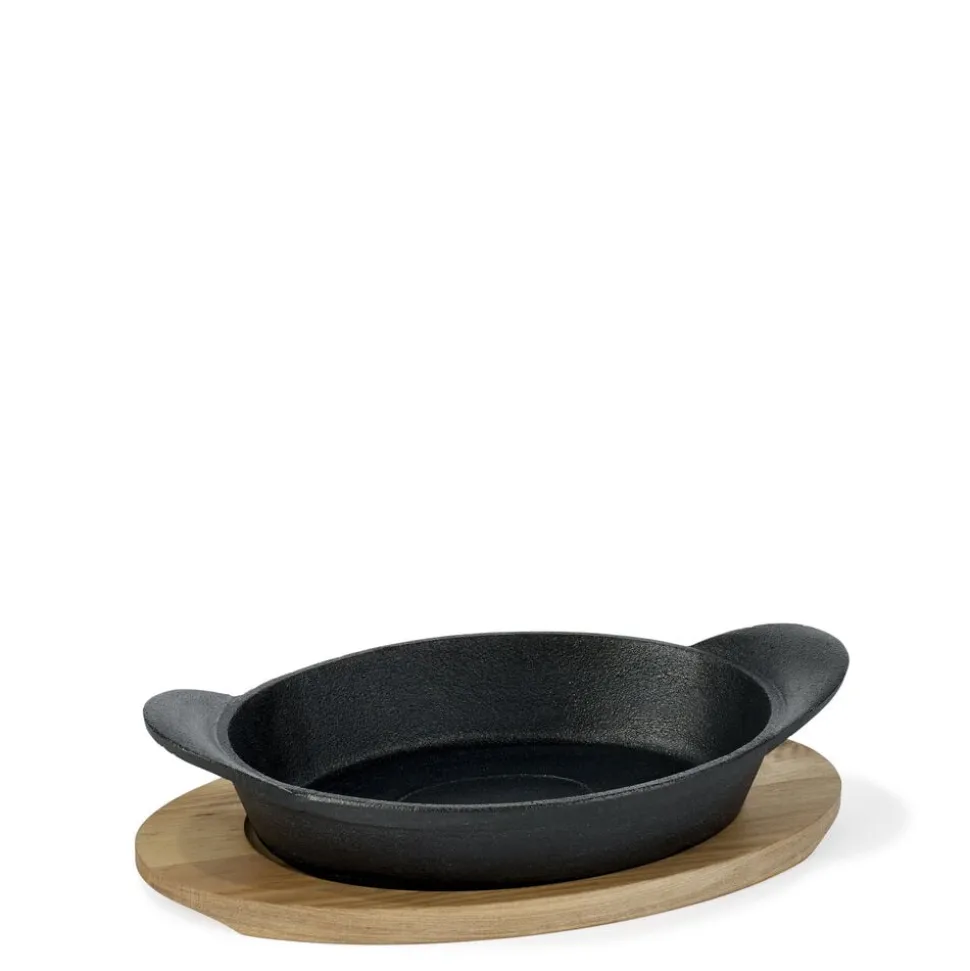 Fad/tallerken i støbejern og bordskåner i ahorn. Egner sig perfekt til servering, men også til tilberedning i grill eller ovn.