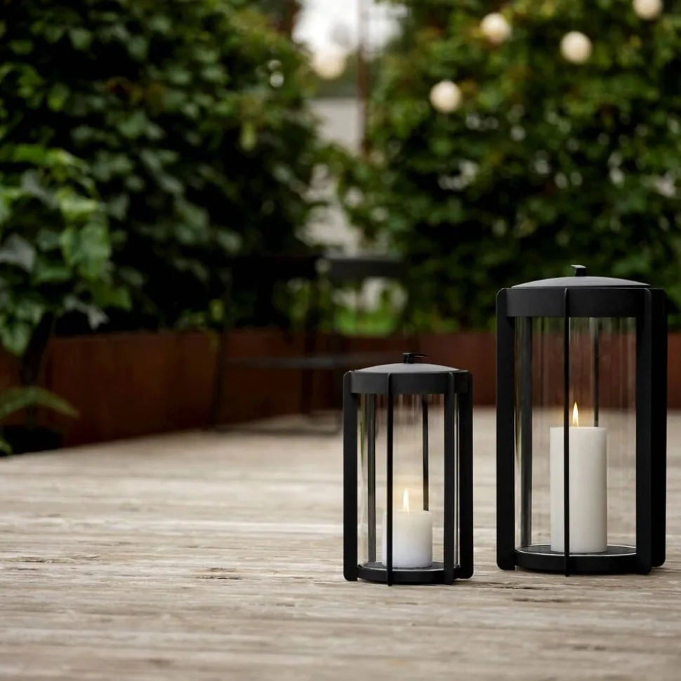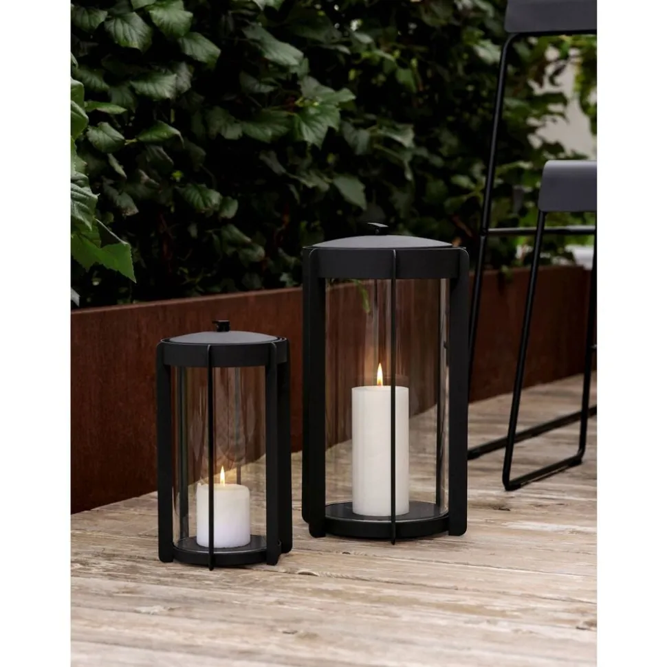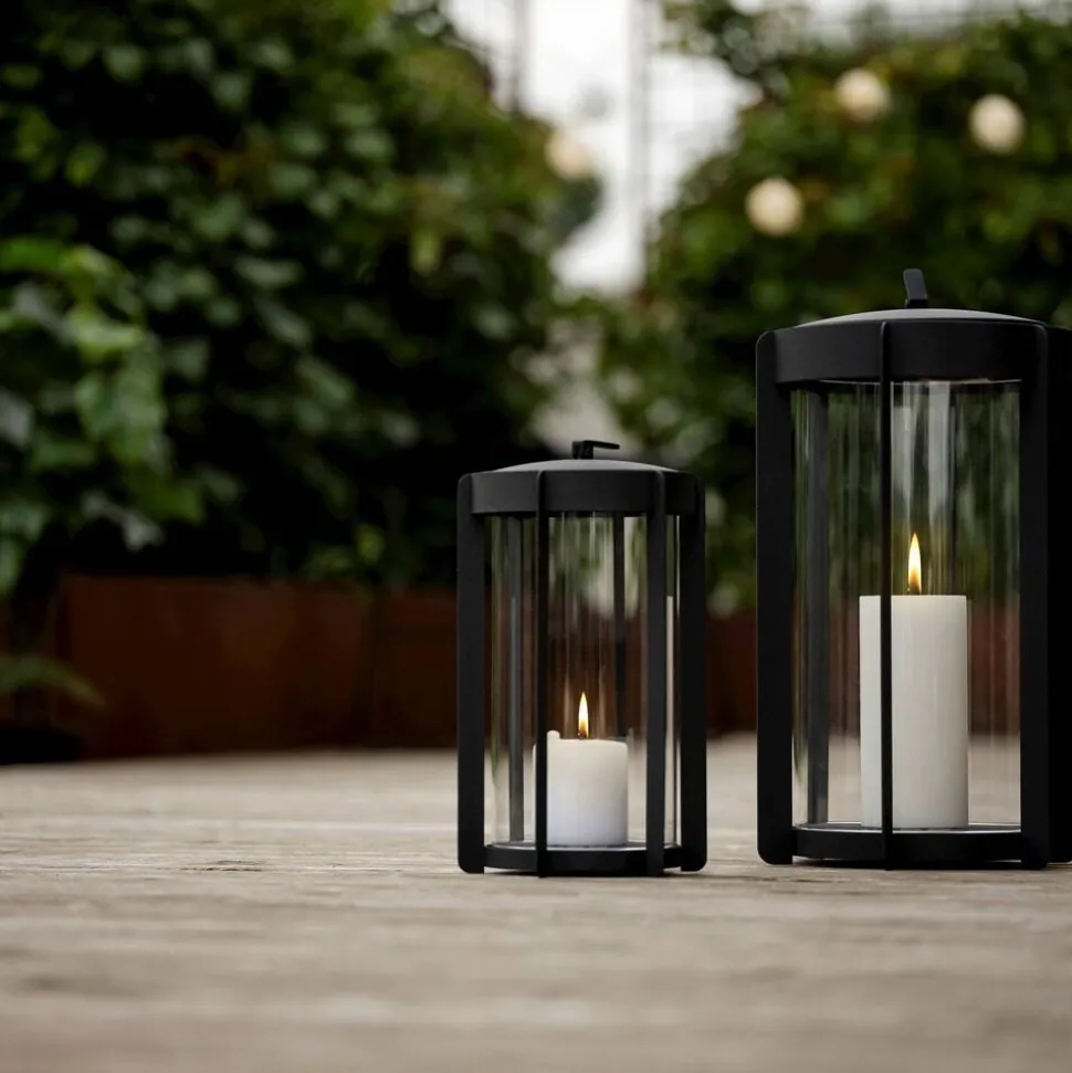 Firefly-lanternerne med glassider findes i to højder, hhv. 25 og 35 cm og er udført i pulverlakeret stål. Topstykket er let at løfte af, når et nyt lys skal sættes i. Du vipper bare den lille silikonestrop op, og lægger den ned igen, når lyset er skiftet. Der er noget tidløst over udtrykket, og designinspirationen er da også hentet flere hundrede år tilbage, hvor datidens vogtere gik med lanterner gennem byerne. Her er en moderne version, der er klar til at kaste hyggelys på terrasser og altaner, når tusmørket melder sig.