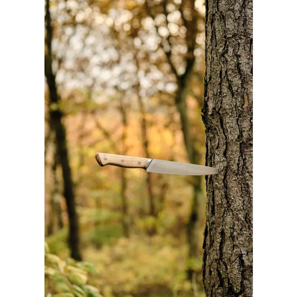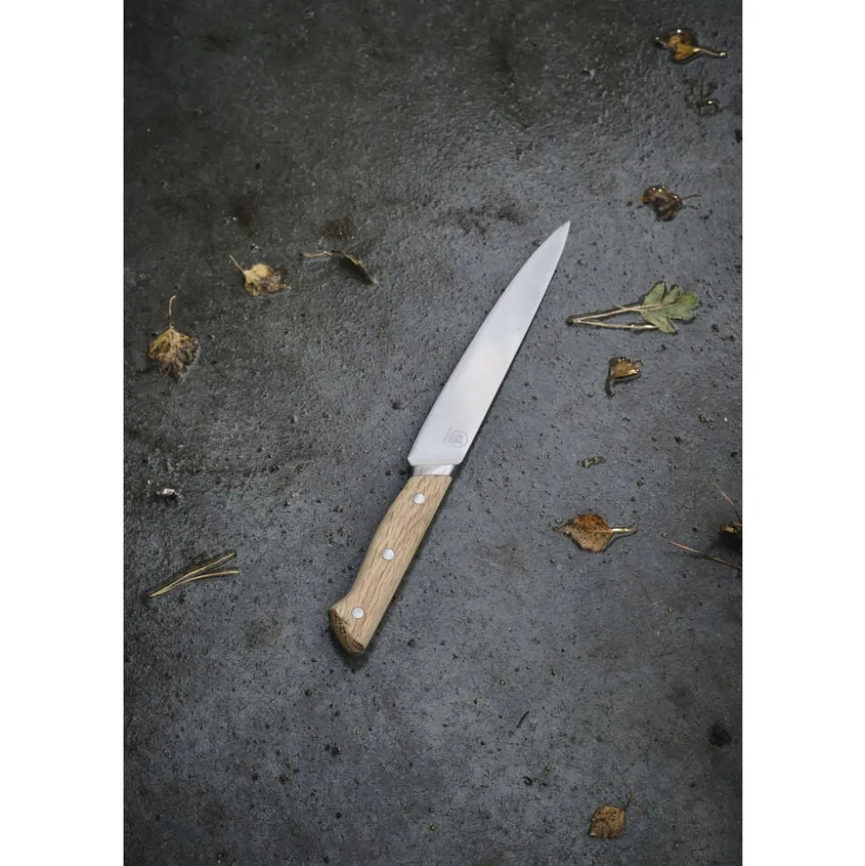 Knivbladet er udført i rustfrit kvalitetsstål og håndtaget i olieret eg, som ved brug vil udvikle patina og blot blive smukkere, jo mere kniven bruges. Træhåndtaget er udformet af ét stykke træ og er behageligt at holde om.
