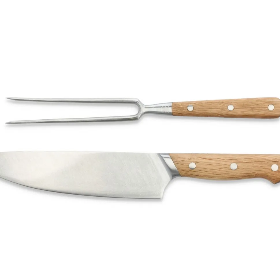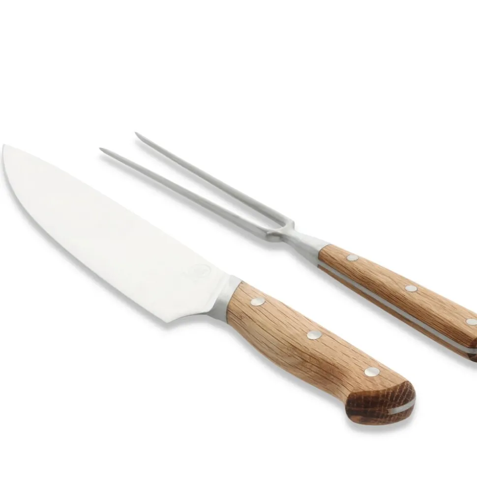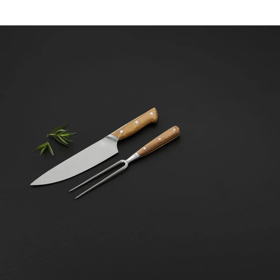 Forskærersættet med stegegaffel og kokkekniv er velegnet til udskæring af kød, fjerkræ m.m. Gaflen og knivbladet er udført i rustfrit kvalitetsstål og håndtagene i olieret eg, som ved brug vil udvikle patina og blot blive smukkere, jo mere sættet bruges. Træhåndtagene er behagelige at holde om.