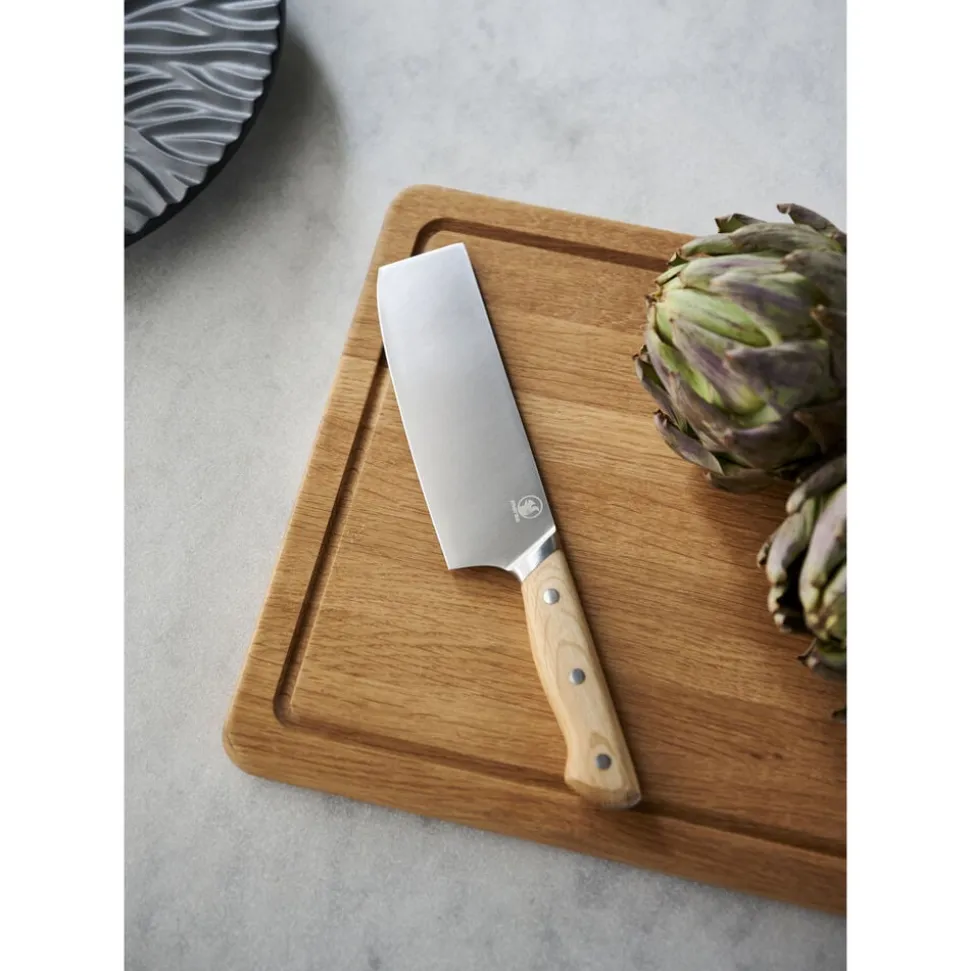 Knivbladet er udført i rustfrit kvalitetsstål og håndtaget i olieret eg, som ved brug vil udvikle patina og blot blive smukkere, jo mere kniven bruges. Træhåndtaget er udformet af ét stykke træ og er behageligt at holde om.