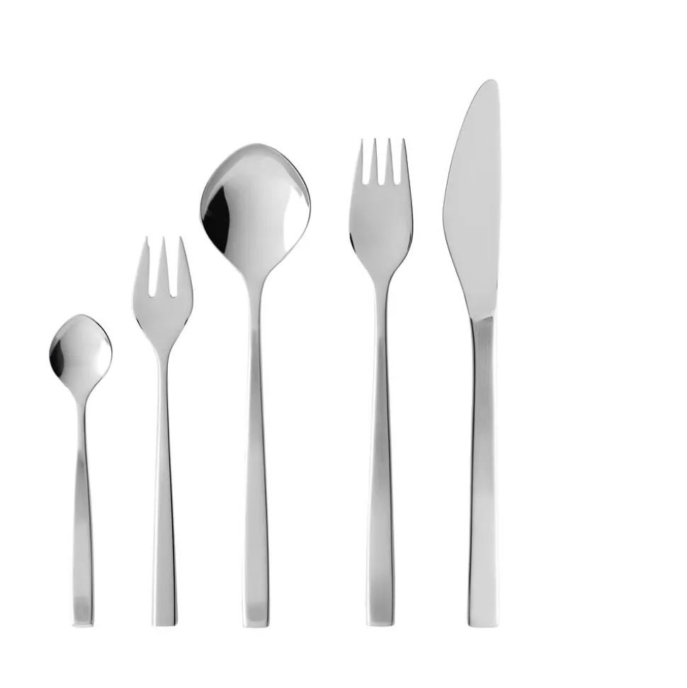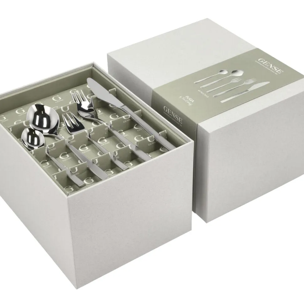 Gense Fuga har et klassisk design med blødt afrundede linjer, der hviler behageligt i hånden, og en raffineret kontrast i de matte skafter og blankpolerede hoveder. Tias Eckhoff formgav i 1962 det ikoniske bestik, der i sit design formidler klarhed og præcision, men med et subtilt udtryk.