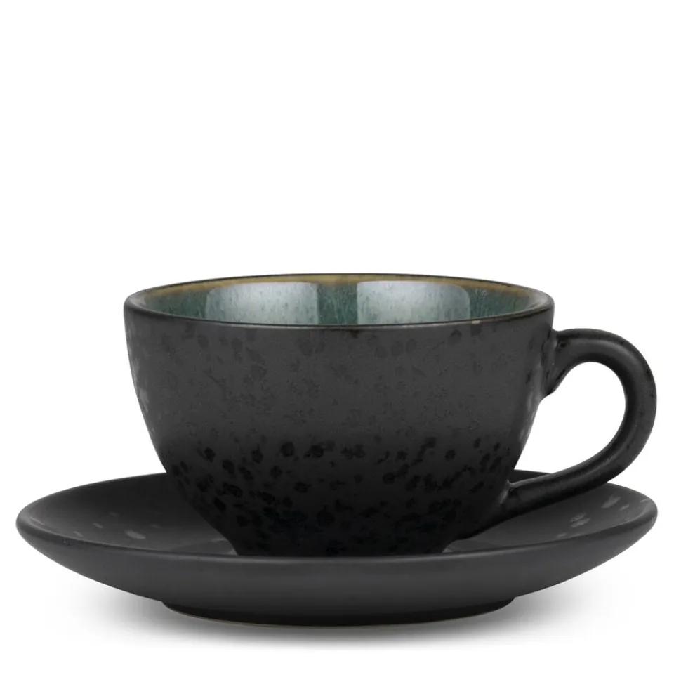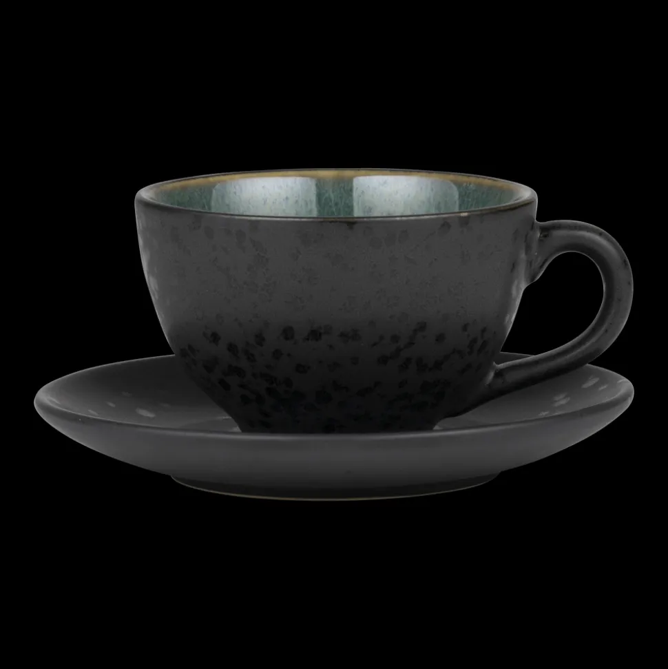 Nyd din cappuccino og dine andre kaffefavoritter i den flotte BITZ Kop med underkop. Fremstillet i mat, sort stentøj med blank, grøn glasur på koppens inderside. 24 cl, 6 cm høj. Velegnet til maskinopvask, mikroovn og ovn op til 220 gr.
