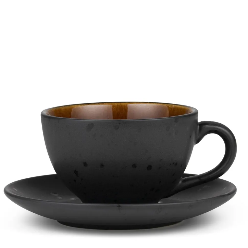 Nyd din cappuccino og dine andre kaffefavoritter i den flotte BITZ Kop med underkop. Fremstillet i mat, sort stentøj med blank, ravfarvet glasur på koppens inderside. 24 cl, 6 cm høj. Velegnet til maskinopvask, mikroovn og ovn op til 220 gr.