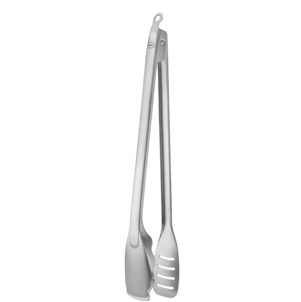 Premium grilltang i rustfrit stål med stor overflade for nem og præcis vending af kød, fisk og grøntsager. Det øverste tanghoved kan også bruges til at tage mindre sideretter, såsom kartofler. Det nederste hoved er udstyret med fedtafløbsslidser.