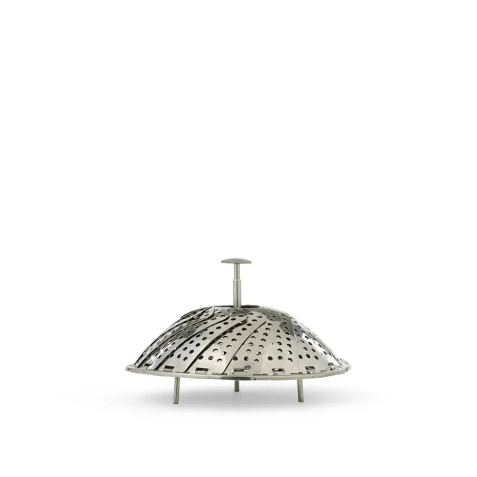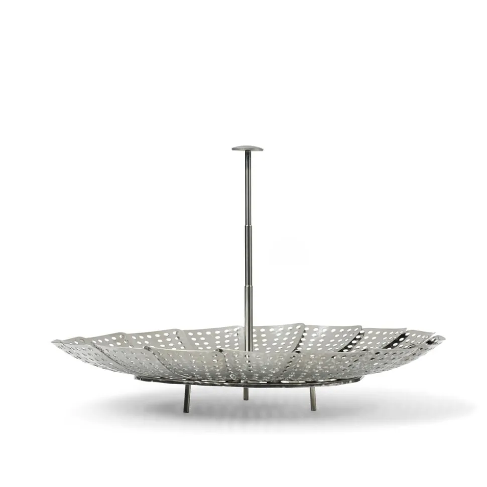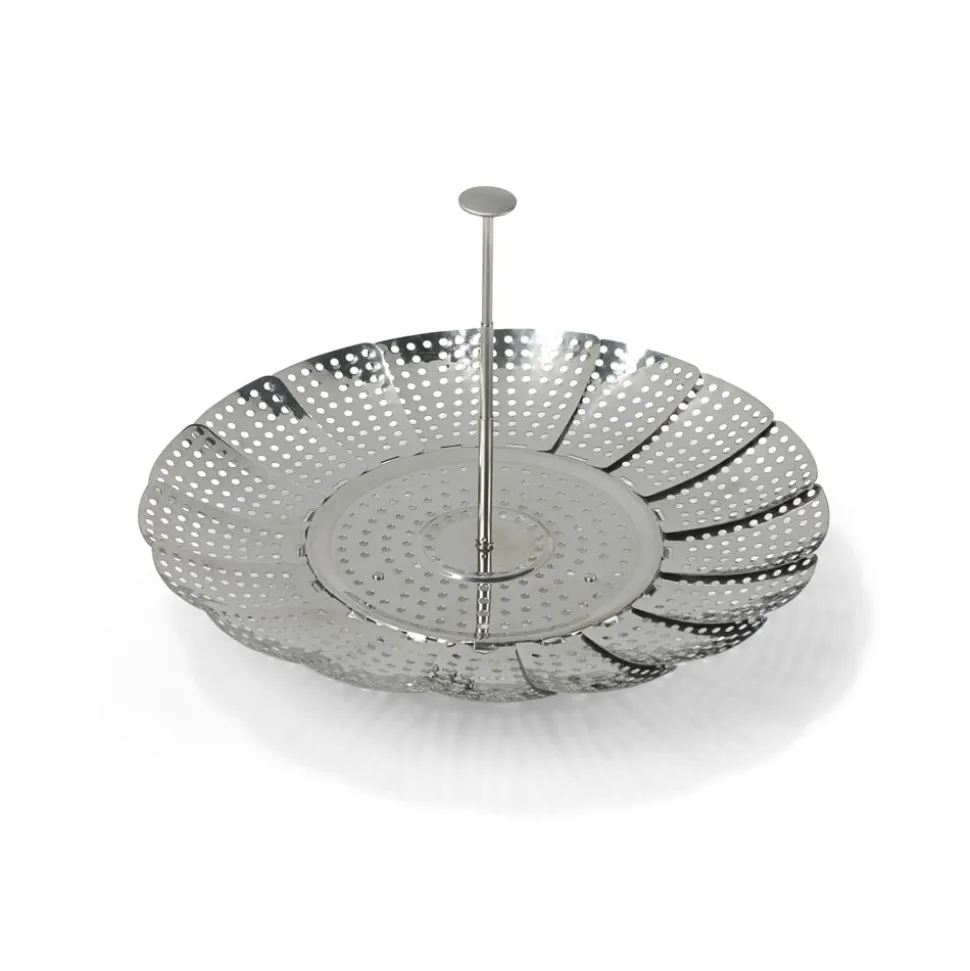 Dampede grøntsager smager af mere og bevarer vitaminerne bedre. Dampindsatsen sættes ned i en gryde med lidt vand og er også velegnet til dampning af fisk og skaldyr. Dia. 28 cm, rustfrit stål med foldbare ben og teleskophåndtag.