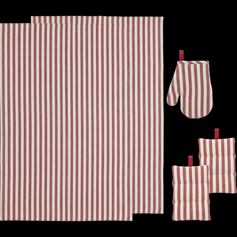 Tekstilsættet i 5 dele i genanvendt bomuld består af 2 viskestykker 50 x 70 cm, miniovnhandske 14 x 21 cm og 2 grydelapper 20 x 20 cm. Red.