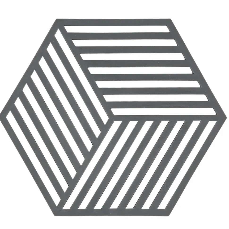 Hexagon bordskånerne i silikone er så grafisk dekorative, at de indbyder til at lægge en flok ud i hele bordets længde uden at stille noget på dem. De er varmebestandige op til 250 °C og kan vaskes i opvaskemaskine. 16 x 14 x 0,9 cm.
