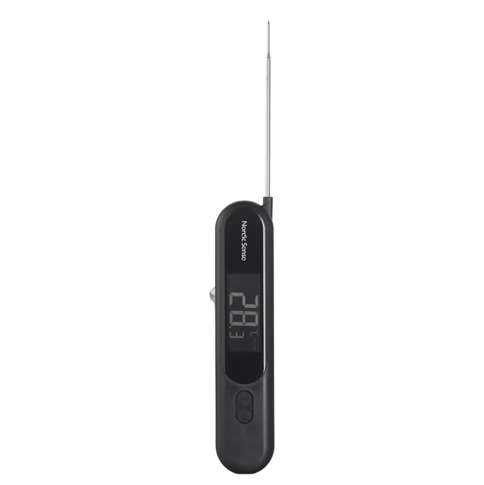 Kombineret termometer til infrarød måling og indstiksmåling. Infrarød måling er velegnet til berøringsfri måling af overfladetemperaturen på stegepanden, smeltet chokolade og lignende, og med spyddet kan du fx måle kernetemperaturen i din steg.
