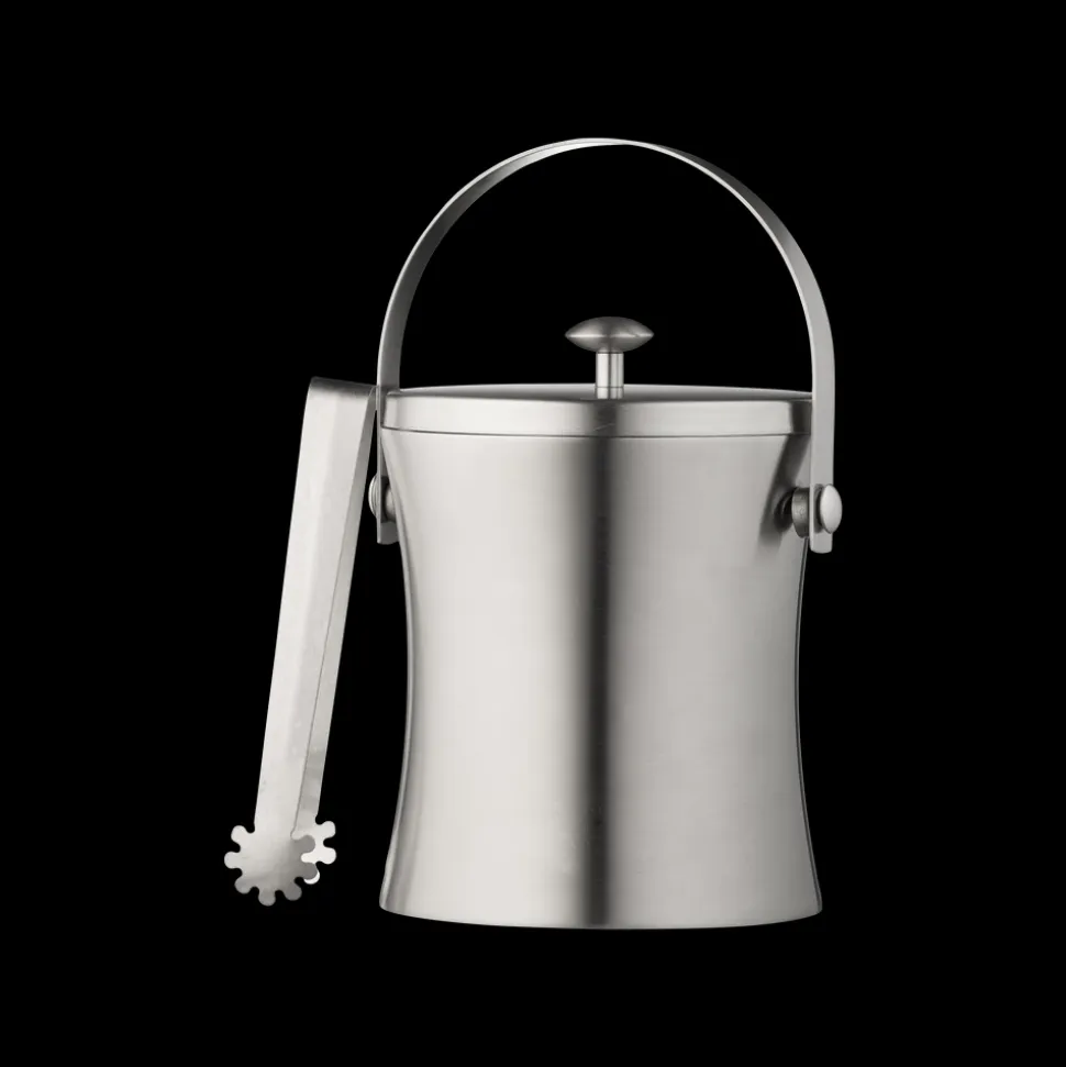 Funktionel isspand i blankpoleret rustfrit stål, med hank og integreret tang. Isspandens dobbeltvæg holder isterninger kolde, mens den aftagelige rist adskiller isterningerne fra det smeltede vand.