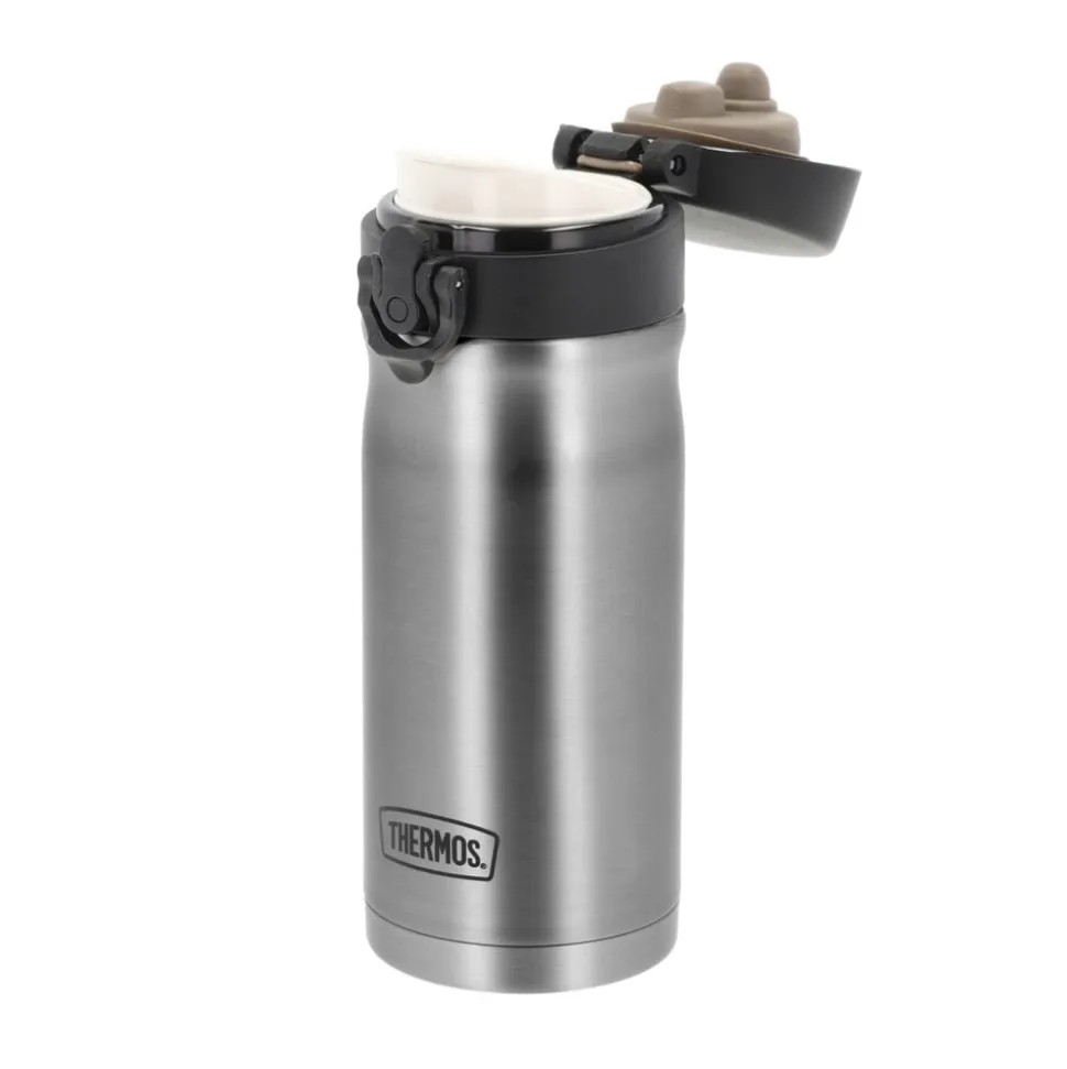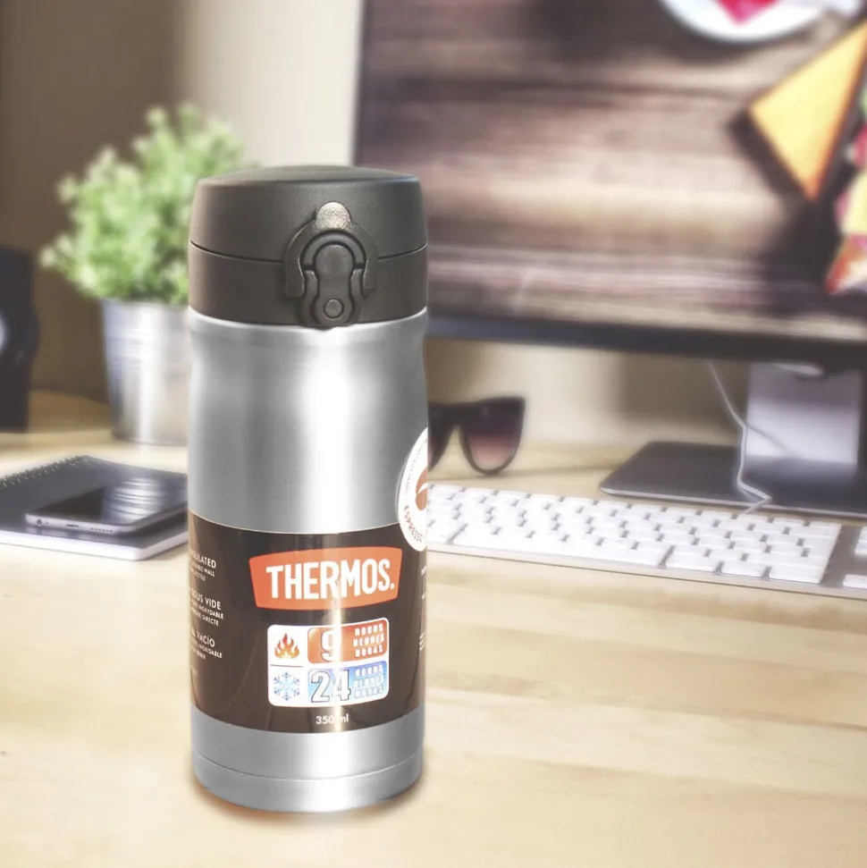 Thermos JMY 350 ml er en smart blanding af en lille termoflaske og en termokop fremstillet i rustfrit stål med et drikkelåg. Kan bruges til både til kolde og varme drikke. Holder indholdet varmt i op til 9 timer og koldt i op til 24 timer.