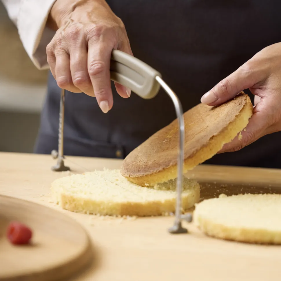 Med denne justerbare kagebundsdeler kan du skære dine hjemmebagte kagebunde med et pænt, lige snit. For det bedste resultat, sørg for, at kagen er helt afkølet, før du begynder at skære, og brug små savende bevægelser. Juster højden på kagebundsdeleren, så du får præcis den tykkelse, du ønsker. Velegnet til kager med en diameter på op til 25 cm. Vaskes med varmt vand og sæbe før første brug. Håndopvask anbefales.